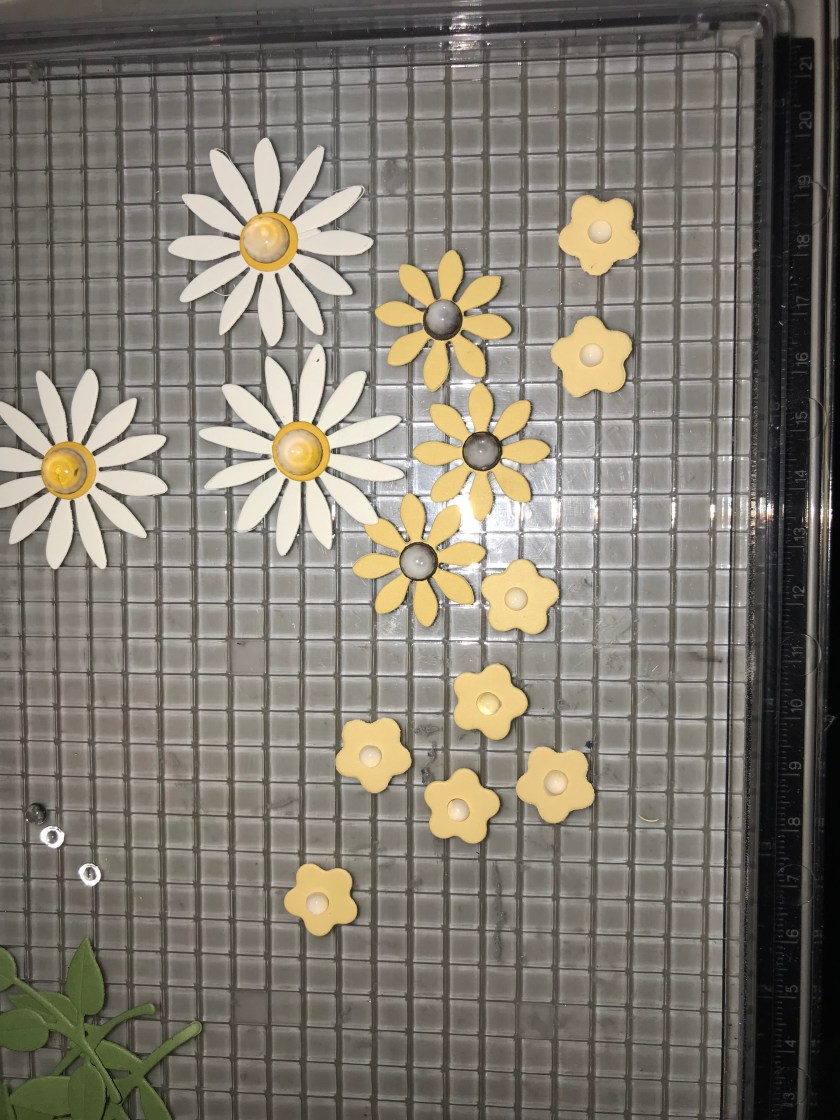 Flowers, I assembled lots of flowers and leaves. I added clear plastic dots in the centers for dimension