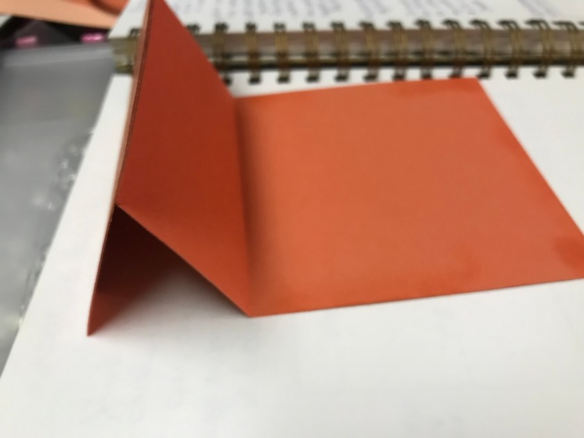 To make the card base I used a piece of Calypso Coral cardstock that is 8 1/2″ x 4 1/4″ scored at 4 1/4″ and 6 3/8″, and another piece of card stock cut at 4 1/4″ x 4 1/4″ (sorry I forgot to take a pic of this with the Coral cardstock but the measurements are the same)