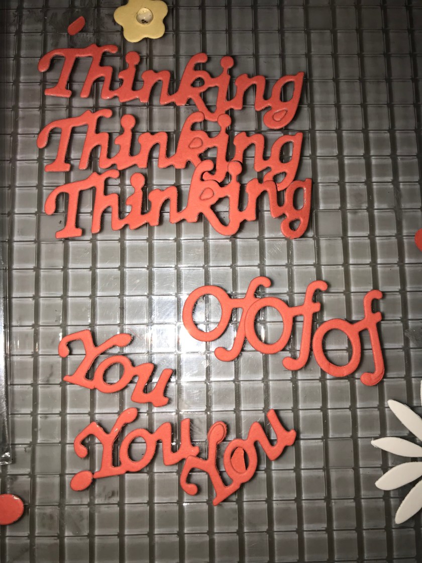 I cut the “Thinking of You” message with a die from my stash, I cut it out three times and layered one on top of the other for dimension.