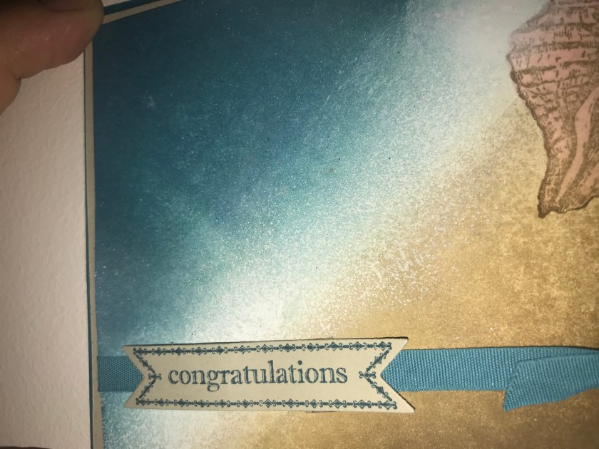 This card would make a great retirement card or the sentiment can be changed to a birthday card for someone who loves the beach. You can almost see the waves crashing against the shore when you tilt the card and the little bit of dimension of the seashell.