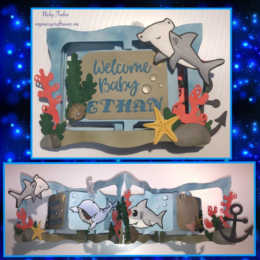 I have been asked to make several cards in the past, but this is a first, I was asked to make a baby card with a shark theme. Hmmmmm I’ve never really thought of a shark theme for a baby card. I was sent a couple of photos of babies room and sure enough it had a shark/ocean theme (there was also a picture of a whale π³) sooooooo this is what I came up with, and I have to say it turned out pretty cute.