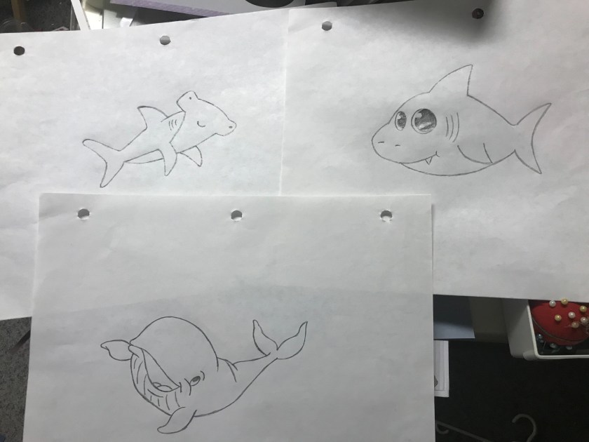 So I needed sharks for this card, and I don’t have sharks in my stash, sooooo I had to figure out where I was going to get sharks from, when all else fails there is always google, I searched shark colouring sheets and I found exactly what I needed, and I’m sure there would have been a way to wifi them to my Scan N Cut but I really didn’t feel like figuring that out so I screenshot them and used my iPad as a light board and came up with these