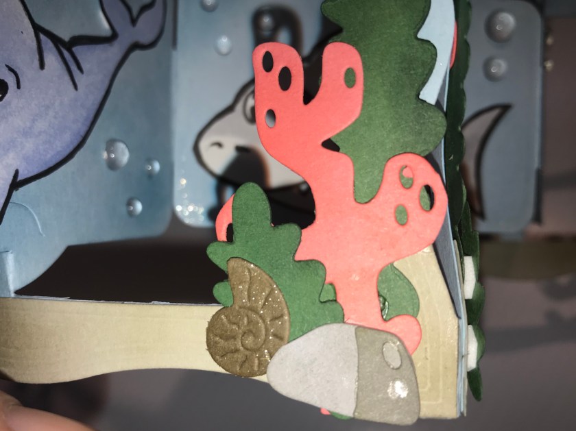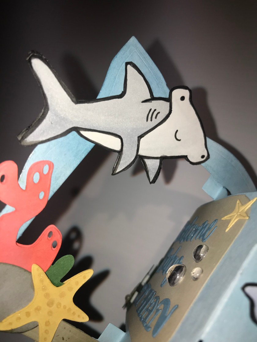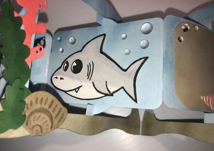 So the middle section flips open to the inside when the card is opened so I only had to decorate the middle section once, but had to decorate the frame twice as we need to see the inside and the outside of the frame. I basically did the reverse image of what was on the outside of the card to the inside, I thought that it would look nicer than see the backs of all the little pieces. I also used the reverse image of the hammerhead shark.