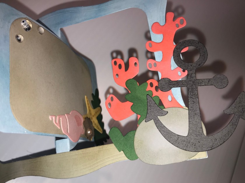 On this last panel, the seaweed and coral are the same, then I used Going Gray (Rock) Basic Gray (anchor, is from Scan N Cut), Pink Pirouette (seashell), So Saffron (starfish), and Crumb Cake (oyster & tag in the centre). To get the texture on the anchor I dabbed it straight onto the ink pad. I also added an itty bitty pearl to the centre of the oyster and added, you guessed it, a few more faux water droplets.