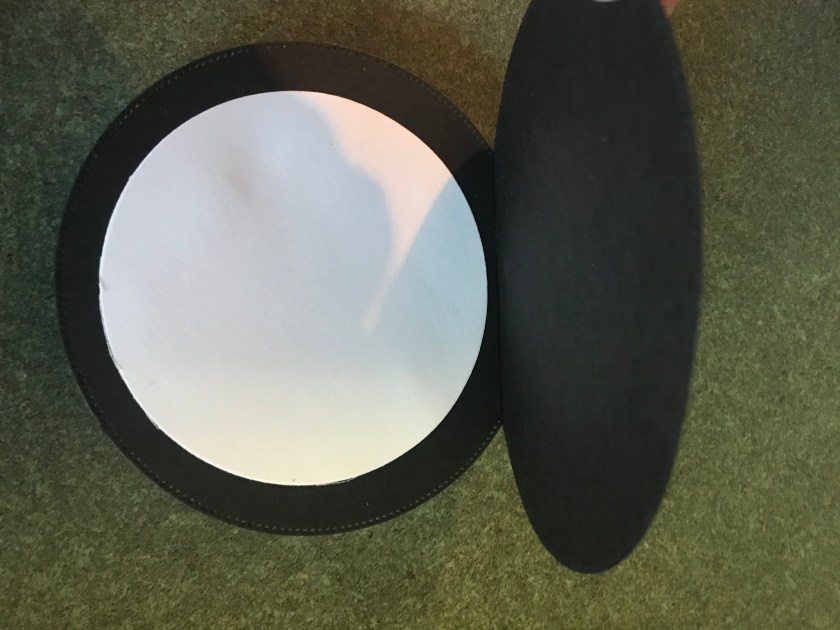 The card base is made up of 2 large black circle die cuts, cut out of Basic Black card stock, the piece that was cut for the back of the card I scored a line about 1/4″ from the top, I added adhesive to the little space between the top of the circle and the scoreline and attached the other black circle on top of that and made sure they lined up exactly. I adhered a smaller white circle to the inside for a place to write a message
