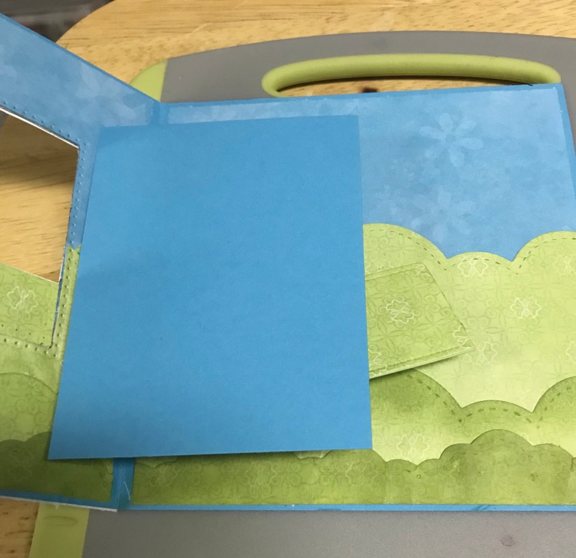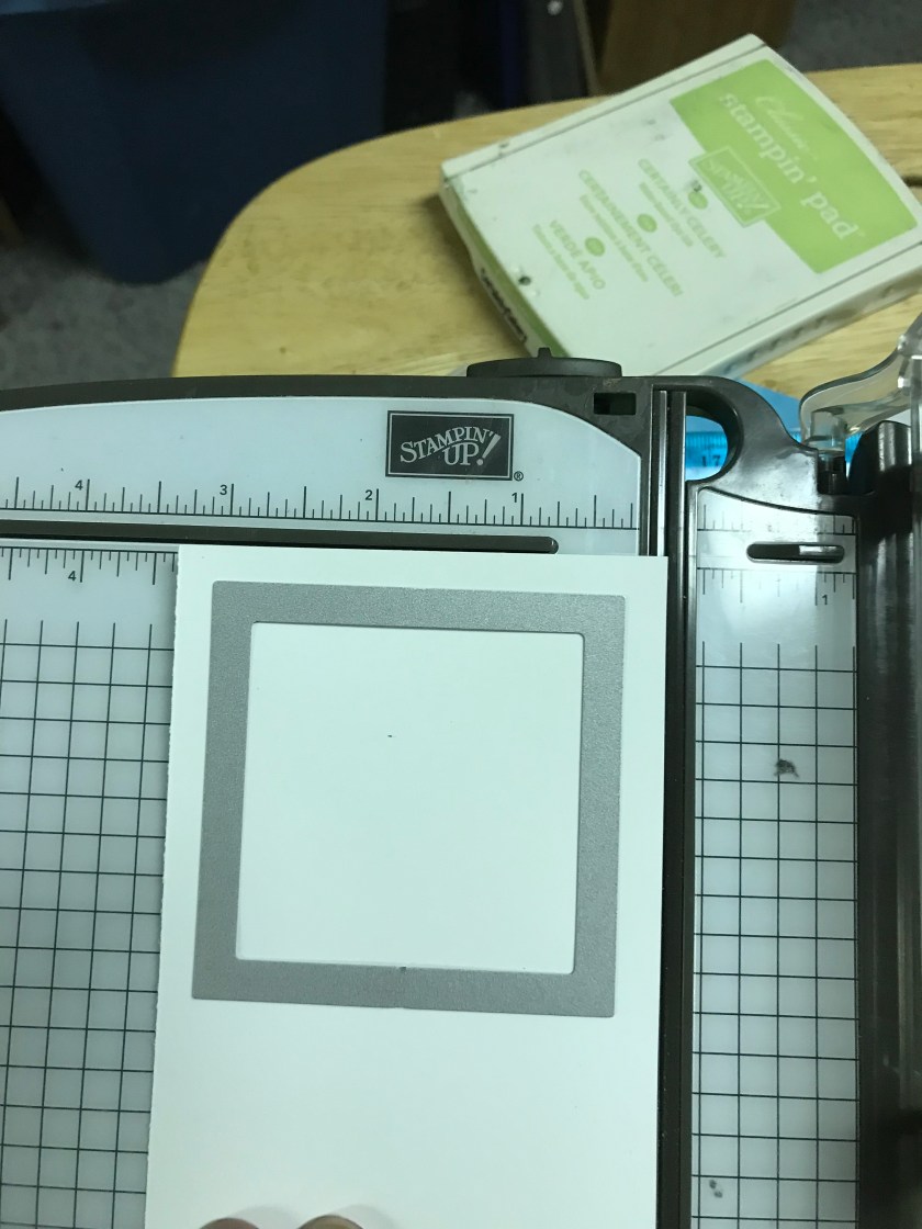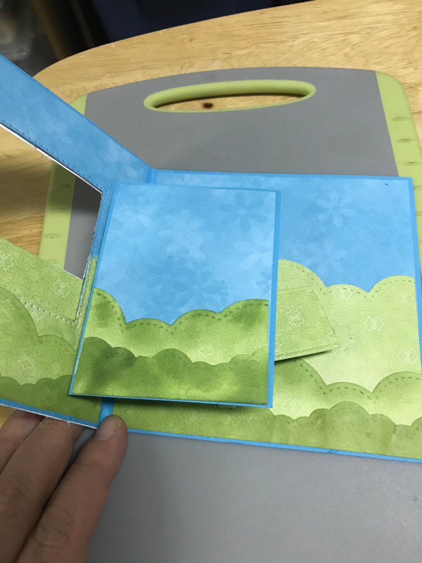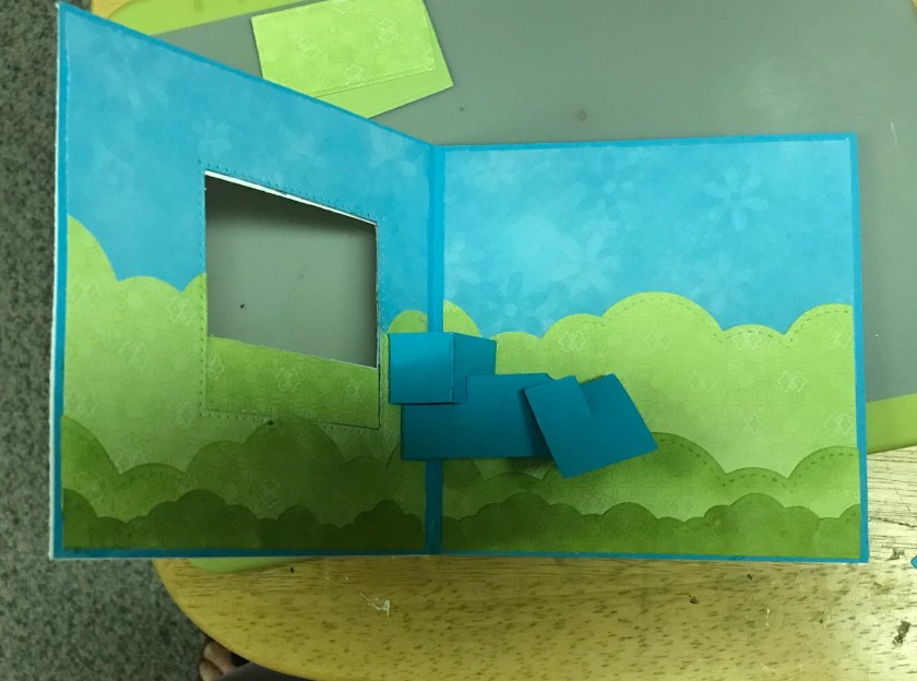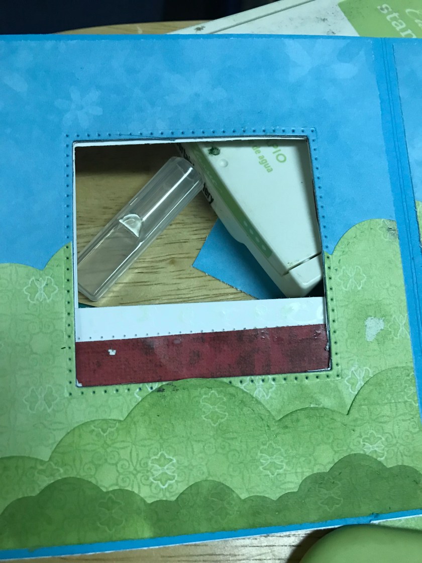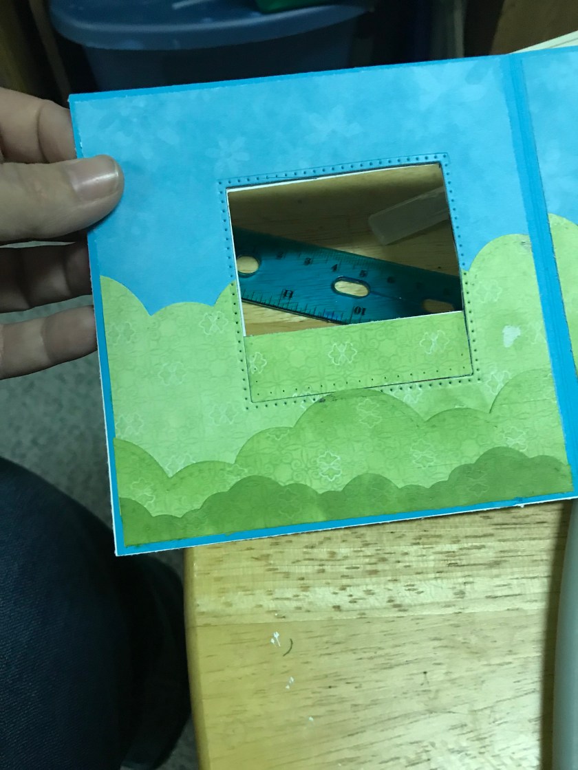The card base size of this card is 51/2″ x 5 1/2″ That I cut out of Tempting Turquoise cardstock. I cut 2 pieces of a turquoise flower print patterned paper for the sky (retired SU paper) it is cut at 51/4″ x 3ish” and then I cut a light green flowered paper (Costco stash) to 5 1/4 and I trimmed it with cloud edges to give a rolling hills kind of look. I didn’t take the blue all the way down as I knew I would have to cut the window and I knew that it would be too much to cut through cardstock and 2 layers of paper, so the green just barely overlaps the blue. I taped the square die to cut out the window and the tape happened to rip the paper ☹️