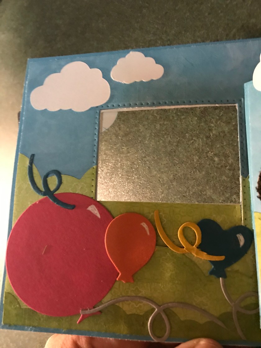 I stamped Happy Birthday onto a cloud, I added extra clouds for more details, and I cut out quite a few balloons and streamers. Most of them are from Karen’s Explosion pop up set http://karenburniston.com/explosion-pop-up/ the largest balloons are from my stash that I purchased second hand. I stamped one large one with the greeting and left one large one for the signature. I added most of the balloons to the spinner square arm, and I added a few to hide the seams around where I had to fix the window from the inside and to hide the other little rip.