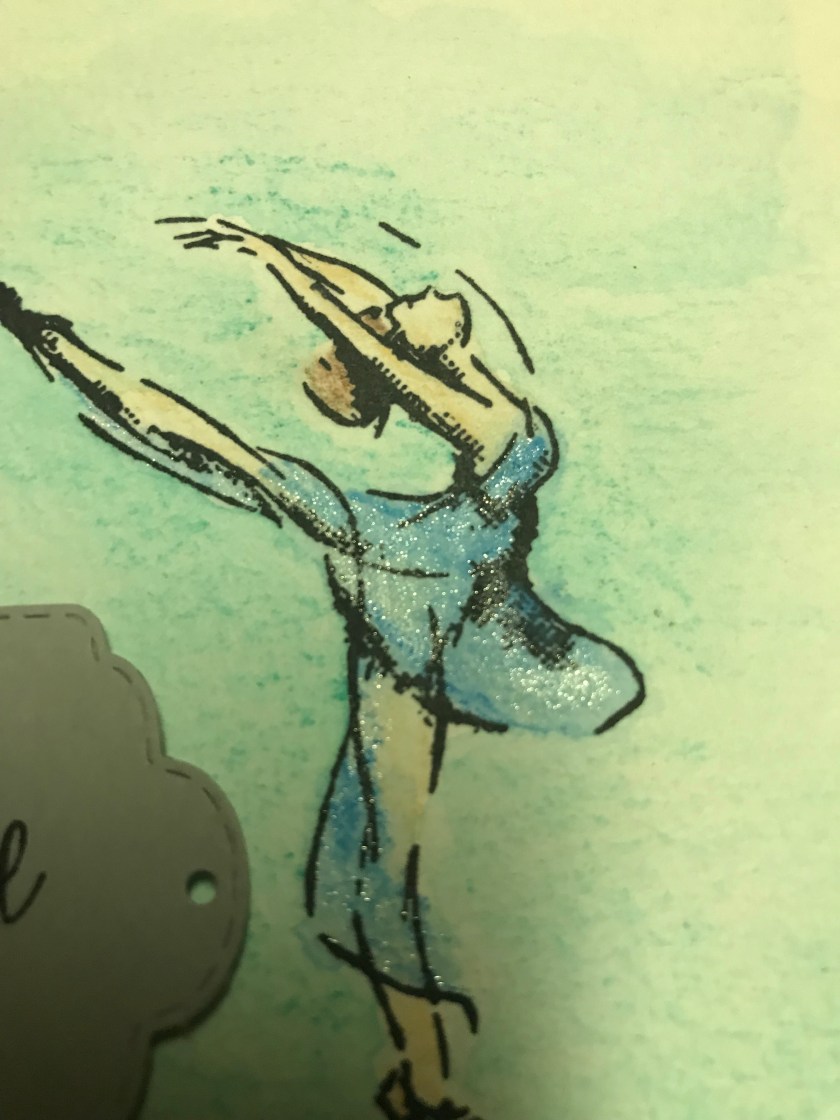 The stamp is from my stash (purchased second hand) I stamped it on watercolour paper with black Staz On ink. Then I used my Crayola watercolour pencil crayons to colour in the dancer and the background.