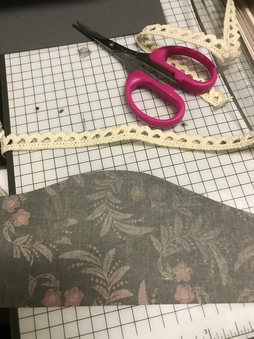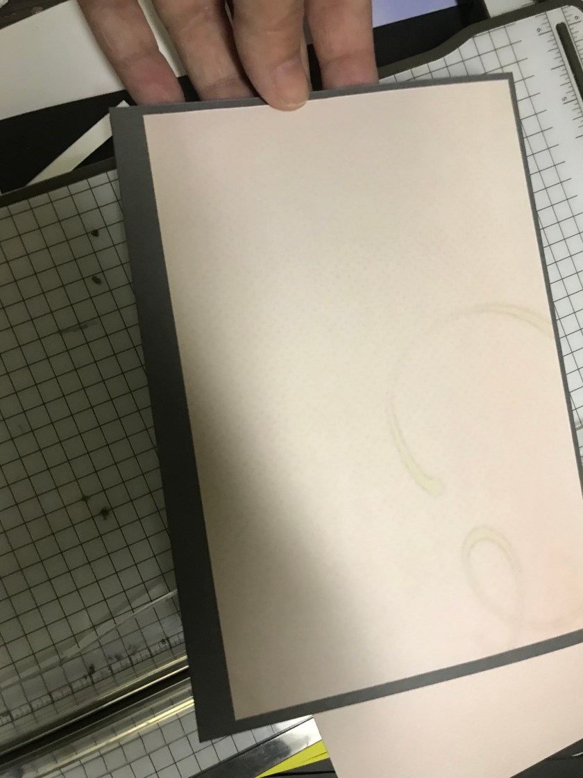 I made the card base 5″x7″ out of Basic Grey cardstock from Stampin Up . I cut a piece of pink Costco paper 6 3/4″ by almost 4 3/4″ (I didn’t go all the way to the bottom as I knew it would be coved) and adhered it to the card front