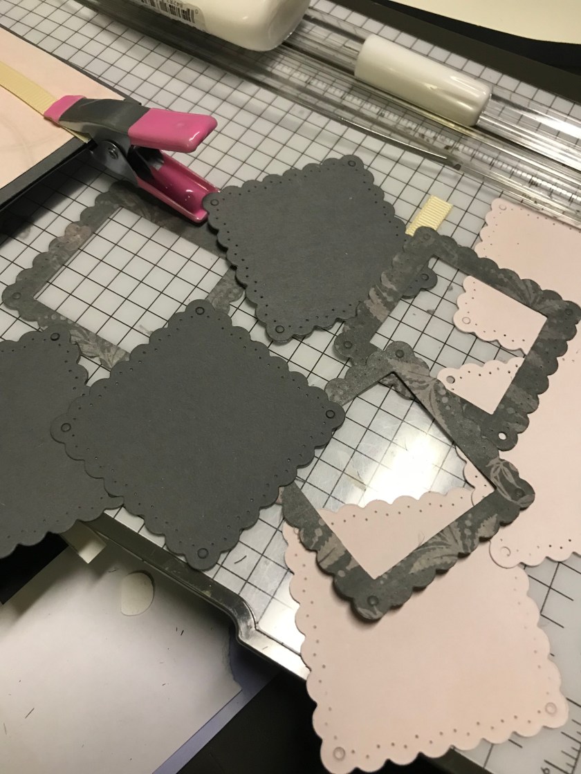 Now for the inside, because you know there has to be an inside lol. I decided to use Karen Burnistons Upsy Daisy Pop up die and I followed her video to create the mechanism. To make the hanging squares I had to cut out a few layers. I cut them out of the Basic Grey Cardstock because the other papers were way to thin. I cut out pink squares and the grey flowered paper was cut into the frames,