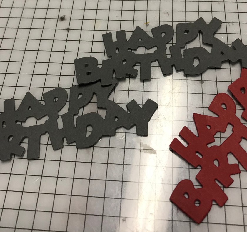 I cut out Happy Birthday twice from Basic Grey cardstock and once from Real Red cardstock.