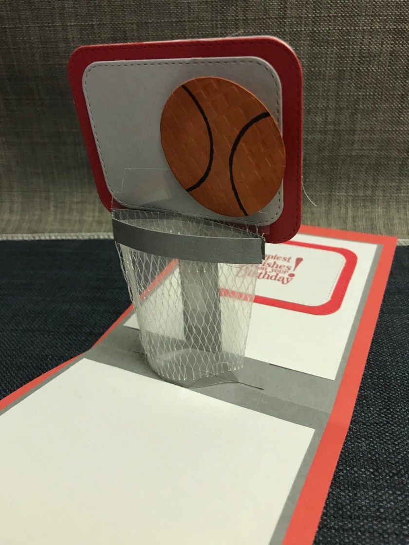 I pulled this card together pretty quick, my daughter needed a Birthday card for a friend who loves basketball and I was trying to think of how I could make a really neat basketball themed card and then it came to me, I could make a pop-up basketball net out of the Coffee Cup Pop-up and I did 🙂 I had to feel my way through making this card as the sizing was a bit off so I had to make some adjustments along the way, but all in all, I think it turned out pretty good.