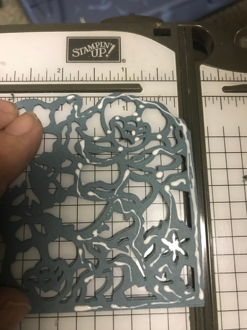 On the back, I adhered a piece of Blue Bayou cardstock to 4 1/4″ x 5 1/2″.
