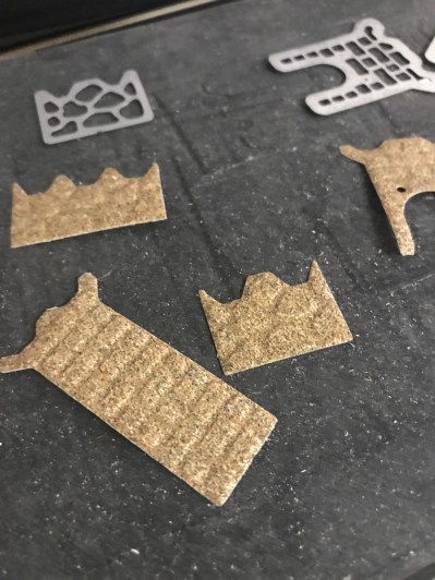 I started cutting out the Castle Pop-up pieces, the Castle base pieces were cut from Crumb cake cardstock and the detailed pieces were cut out of sandpaper. I ran them back through my big shot with silicone matt to emboss the brick and stone details.