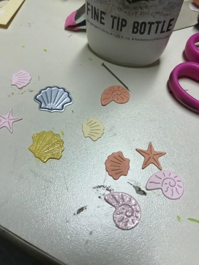The seashells are dies from the Tropical scenes die set, cut out of So Saffron, Pink Pirouette, and Cantelope Crisp. I added some Wink of Stella to them as well.