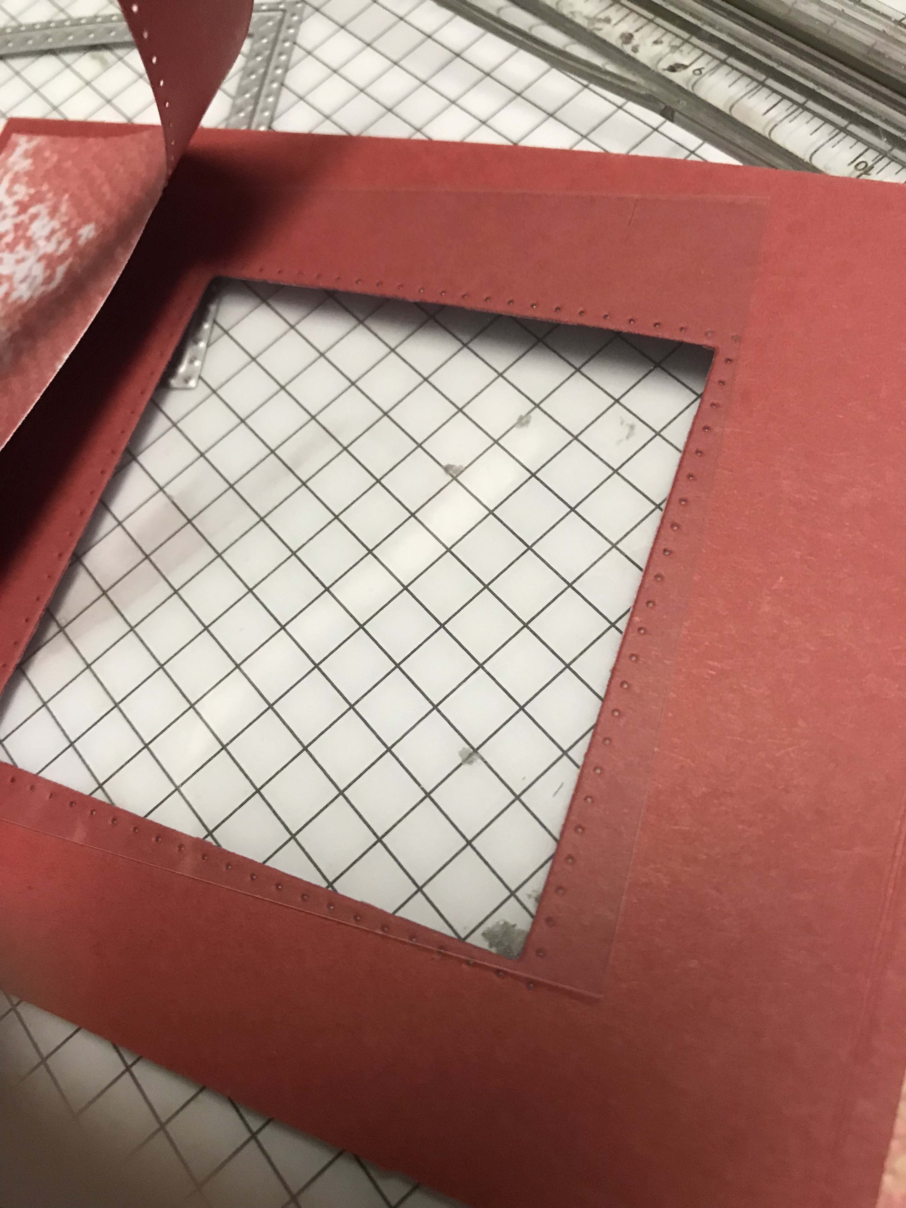 I cut out a frame using the 2 biggest squares with the same paper that I used on the inside. I glued the frame around the window on the front of the card.