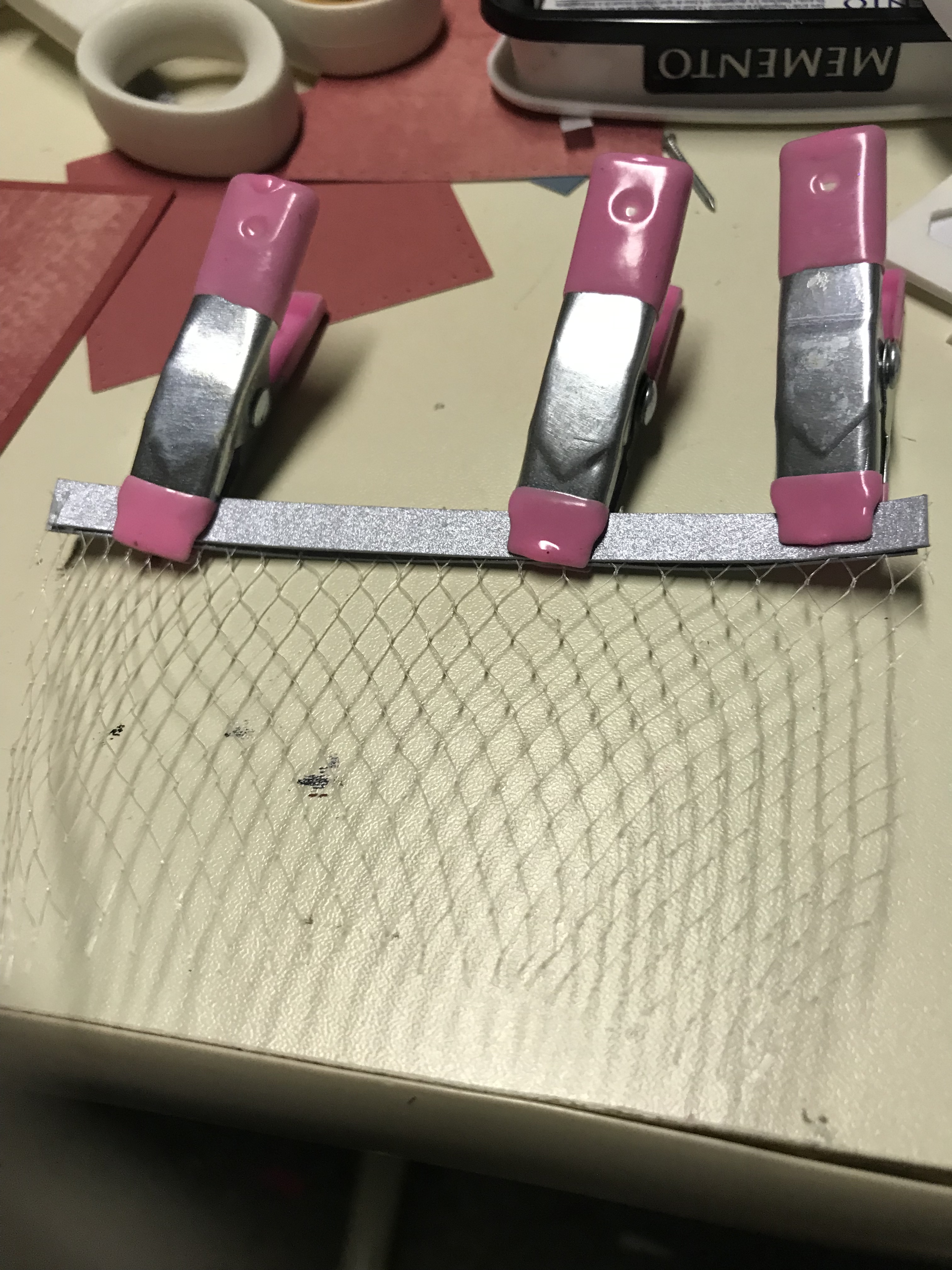 once the net was dry I made it into a hoop, glued the edges together and clamped it until it dried. I know the net is really long, I didn’t want to cut it until I added it into the card.