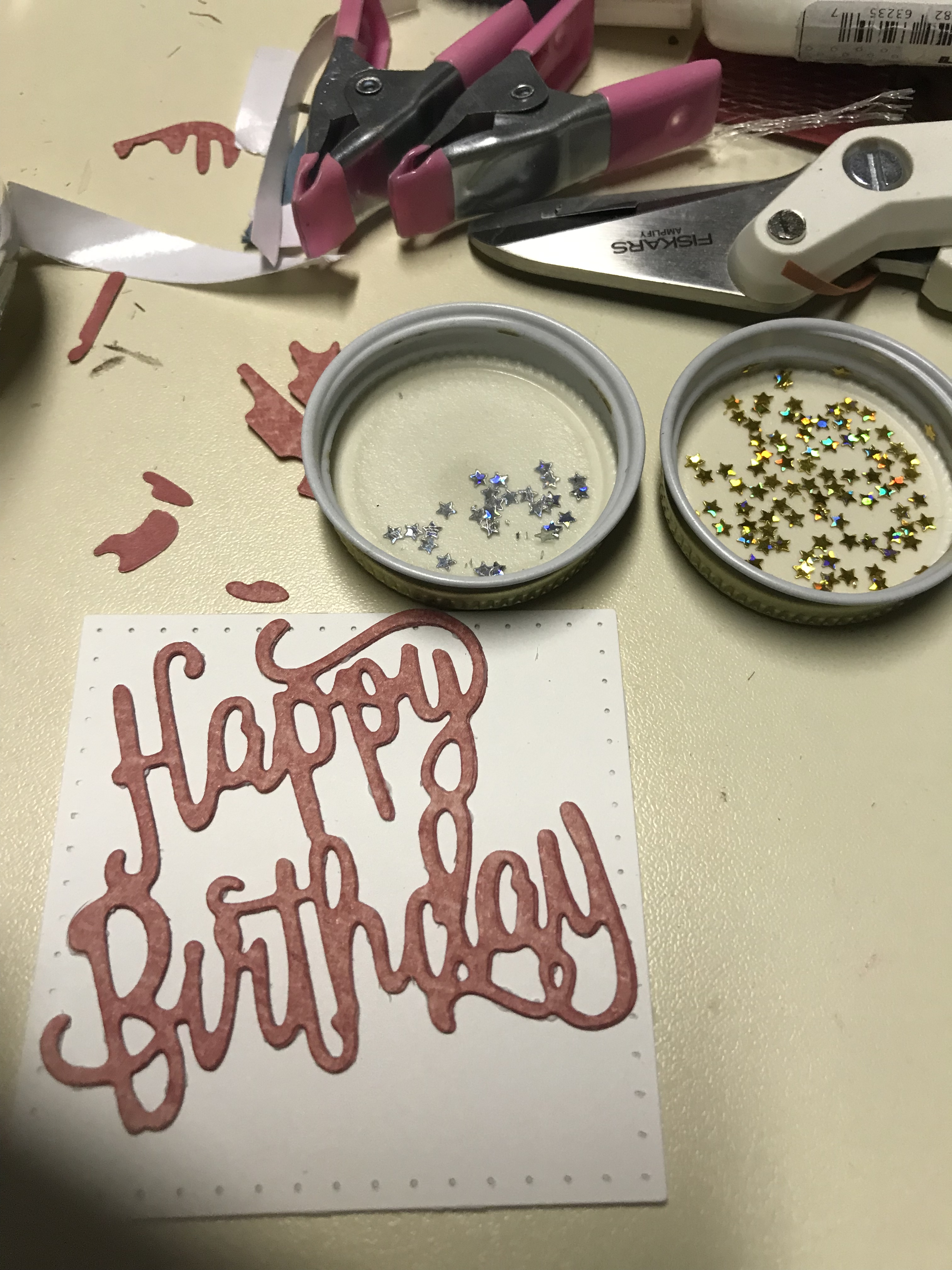 I cut “Happy Birthday” out three times out of the red paper, and stacked them one on top of each other.