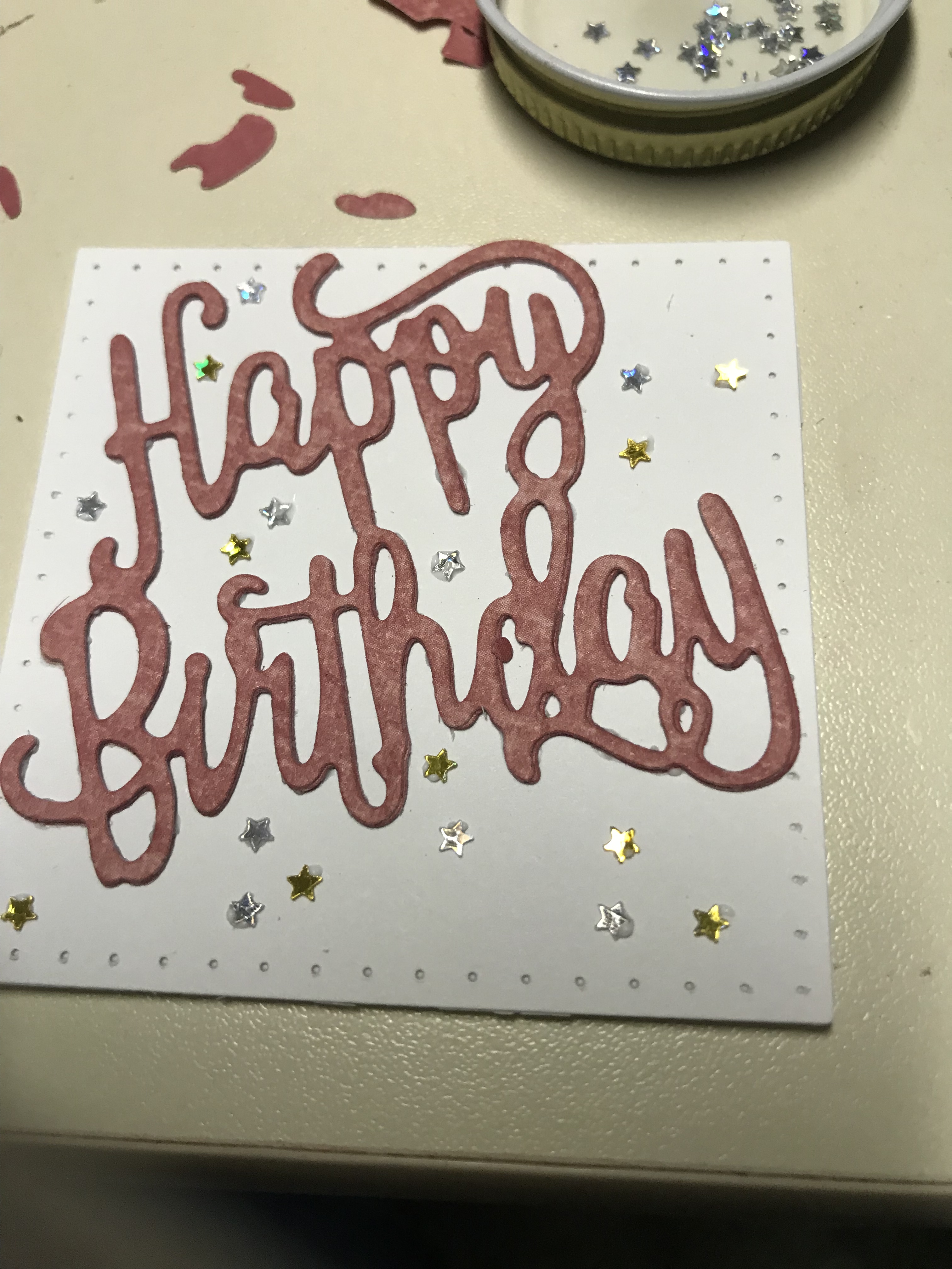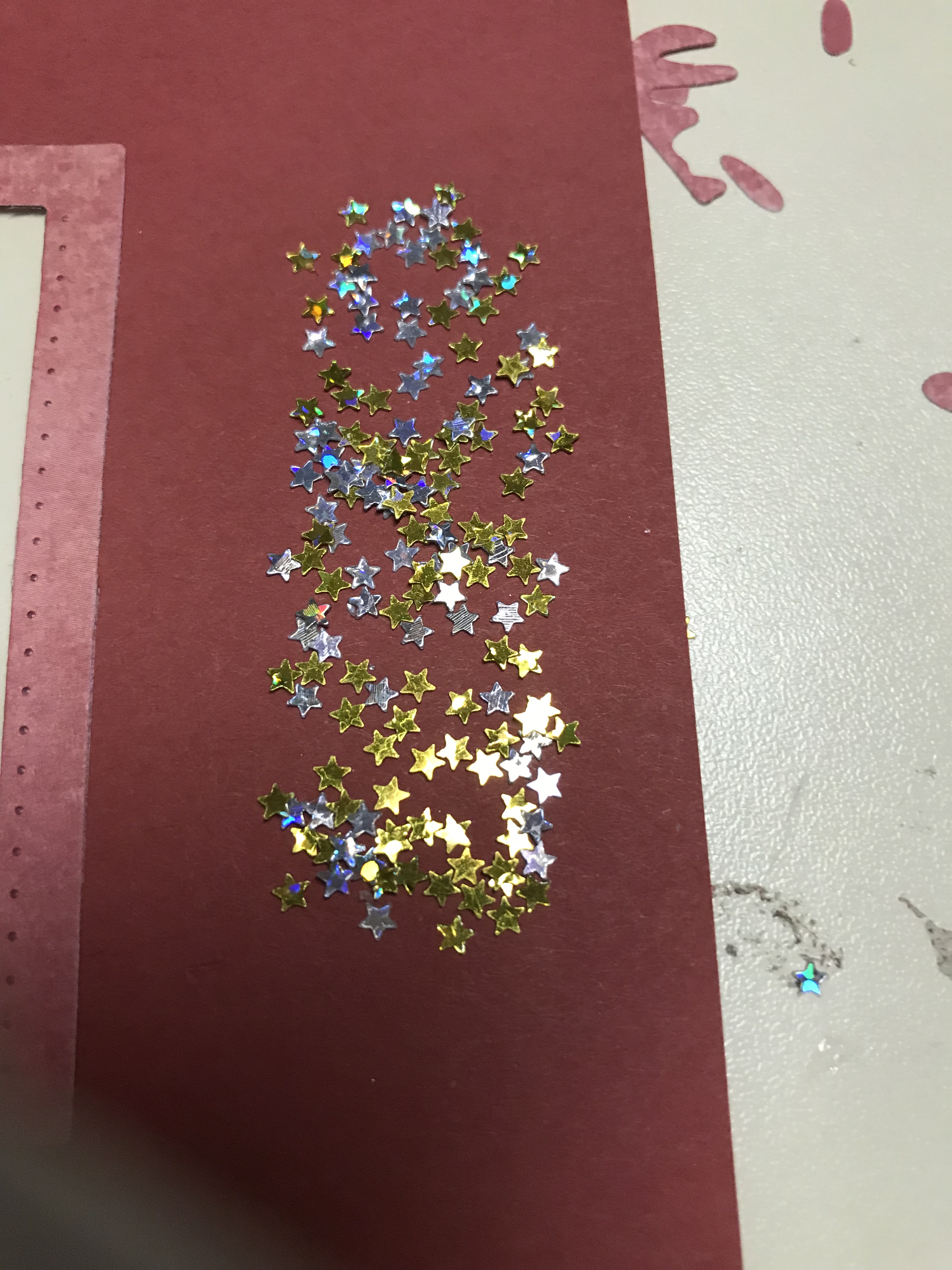 I dug out some itty bitty silver and gold star sequins. and decorated the square.
