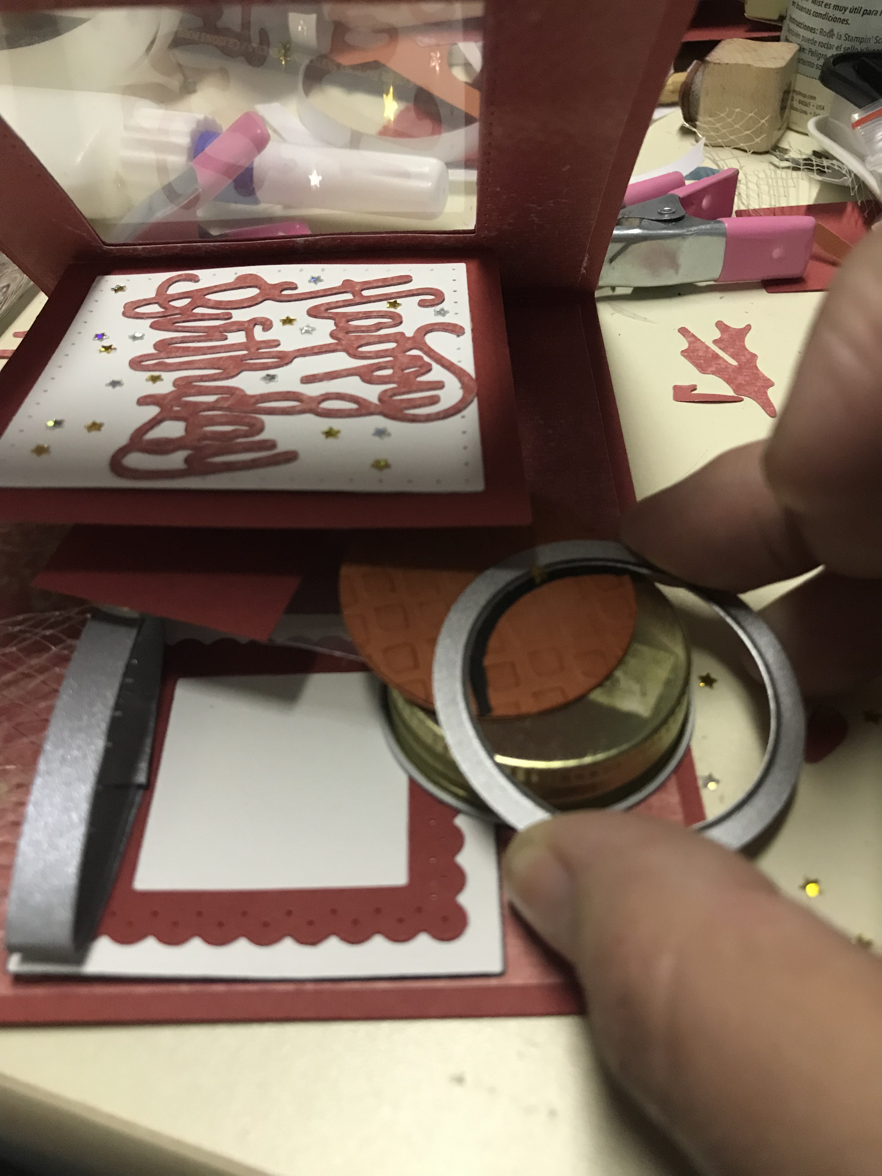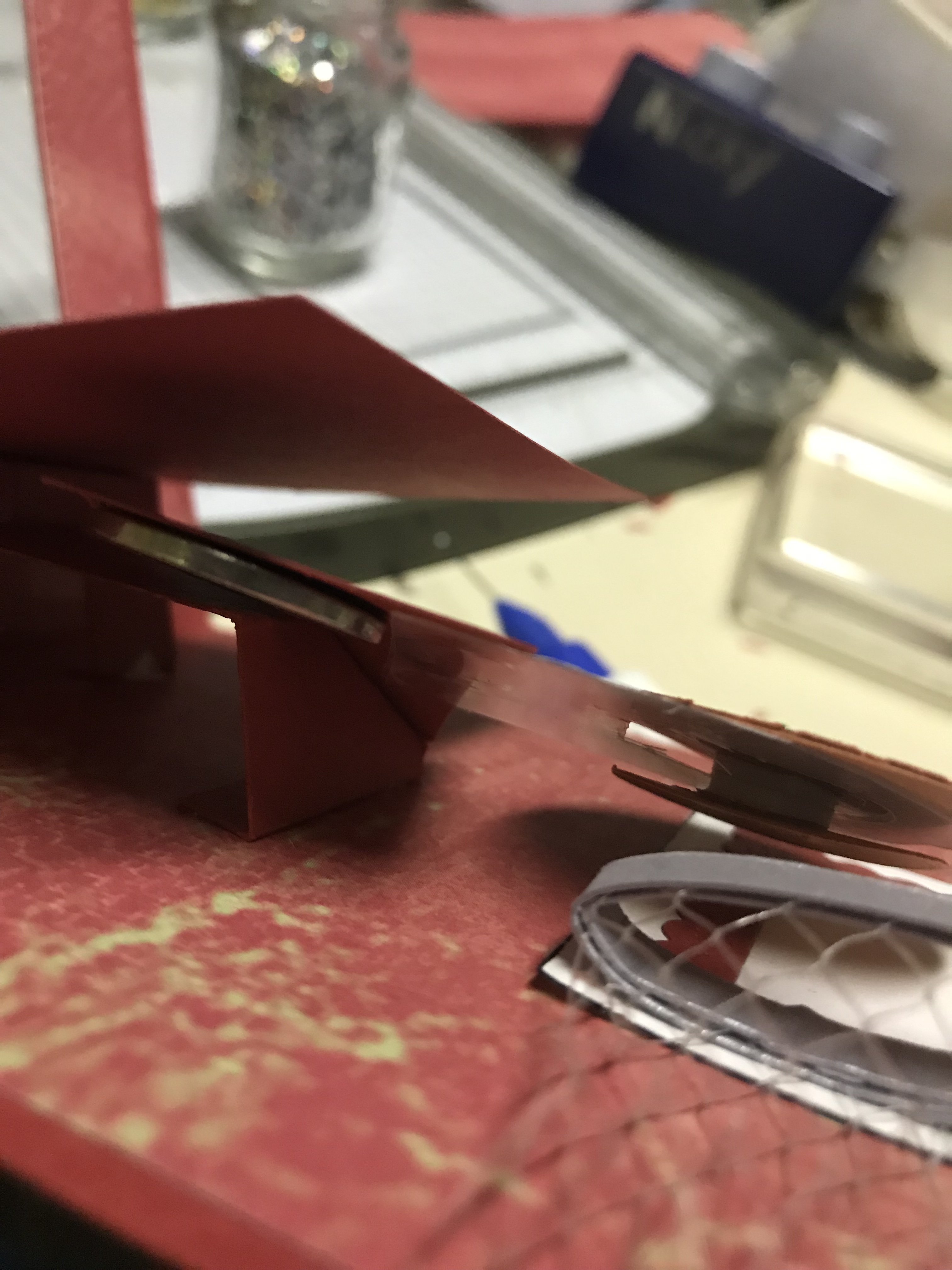 I cut the pieces for the mechanism out of the Riding Hood Red cardstock, I assembled it and added it to the card as per the video directions above.