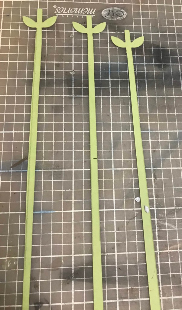Just like in Laura’s directions I only partially cut out the stem and leaves so I can make the stems longer. These stems are from Karen Burnistons Upsy Daisy Pop-up die set https://karenburniston.com/upsy-daisy-pop-up/