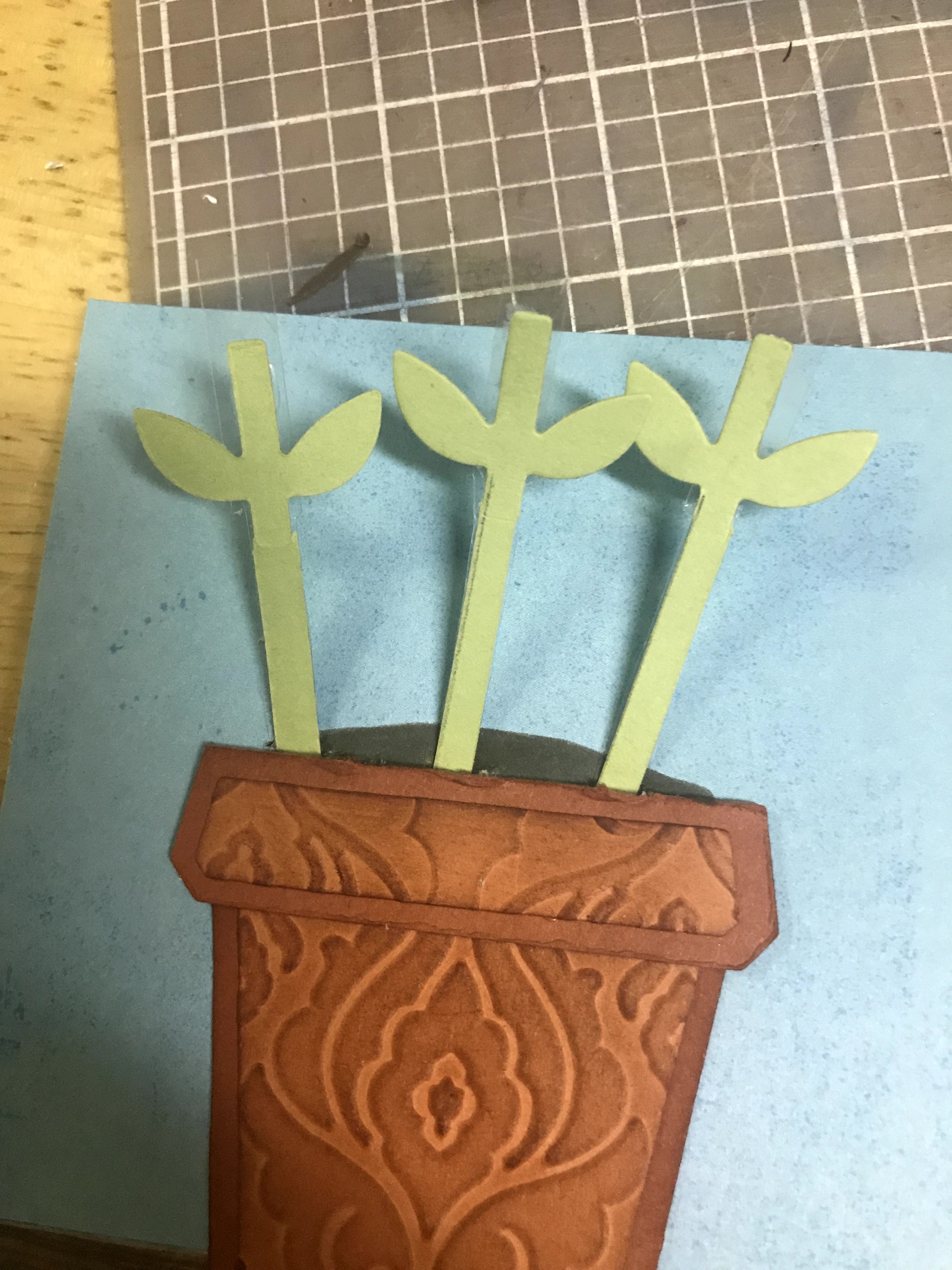 I hand cut a little mound of dirt and adhered it to the card front along with the flower pot.