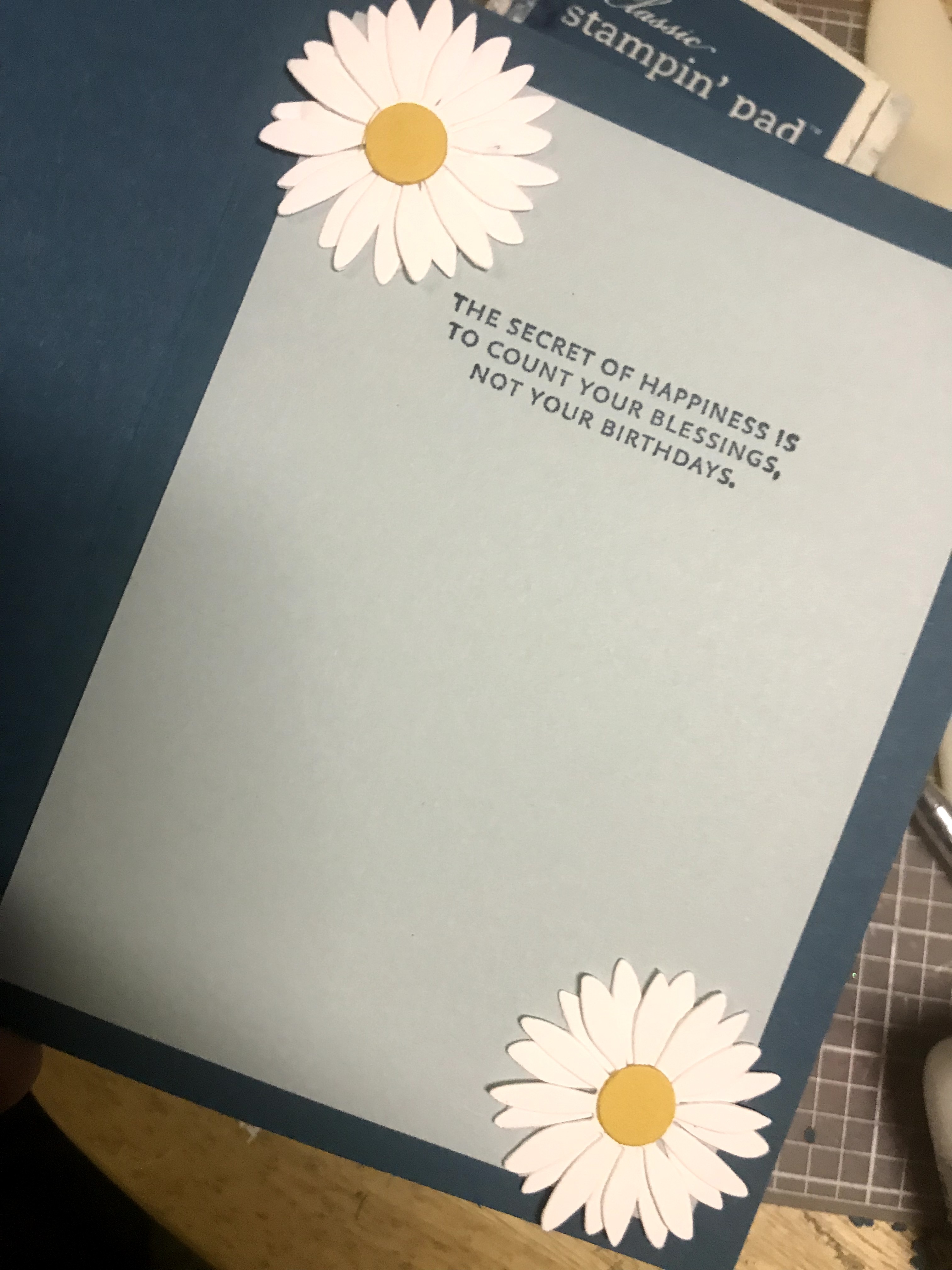 I cut a Pool Party coloured cardstock to 4′ x 5 1/4″,and stamped an old Stampin Up stamp, I stamped it with Island Indigo ink. I added the daisies that I originally planned to have on the front. Waste not want not.