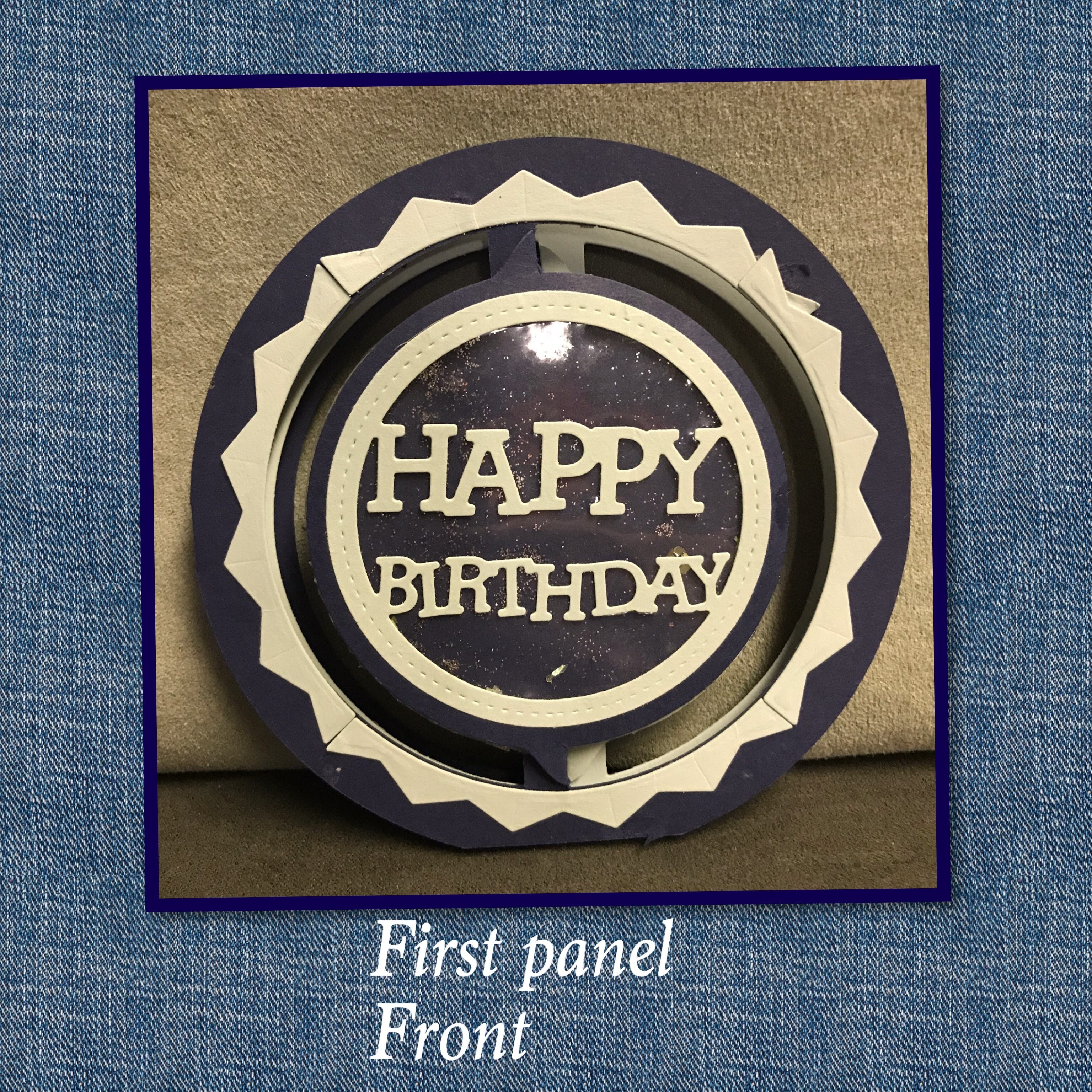 For the front panel I wanted there to be a little bit of a wow so I made a shaker element in the middle of the circle. The “Happy Birthday” die I used I found at a thrift store. The decoration around the ring is from Karen’s Ring Frame Edges die set.