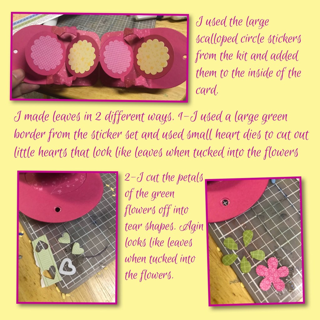 To decorate the inside I used more flower stickers from the kit, and some circles and shapes that I cut out of the patterned paper and some of the So Saffron Cardstock. On the top circle I used a retired Stampin Up stamp set and Melon Mambo ink to stamp the greeting. On third circle I used a heart die to cut a heart out of the So Saffron circle so the pink will peek through. I also decorated with some faux raindrops and itty bitty gems.