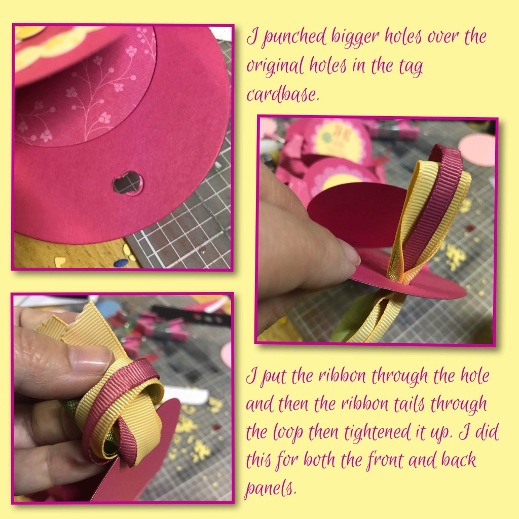 I choose three different ribbons that I grouped together to decorate the tags, One was in So Safron, one was in Rose Red (looks close to the Melon Mambo) and one was a green (tag is missing) all are from Stampin Up and they are all retired.