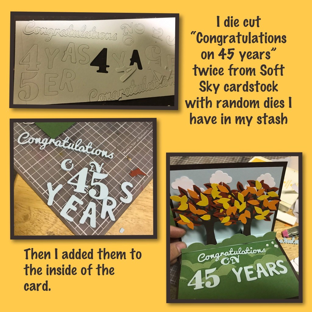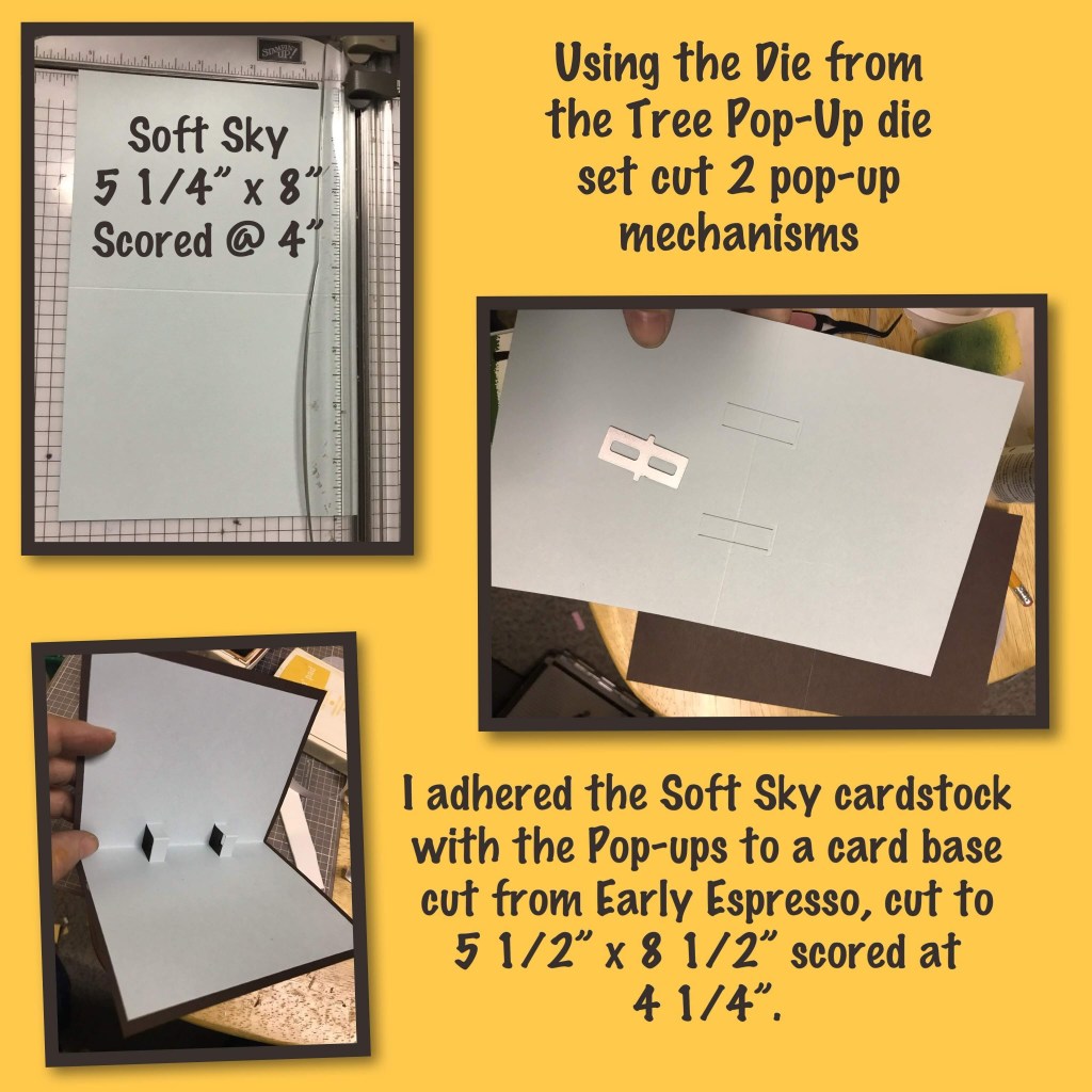 To make the pop-up mechanism I used Karen Burnistons Tree Pop up die set. All the cardstock, Inks and stamps are from Stampin Up and are Listed below in the details.