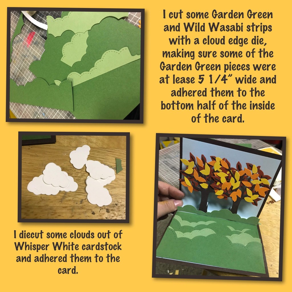 I used a Garden Green cloud edge and adhered it to the front of the trees to make it look like there were shrubs in front of the trees.