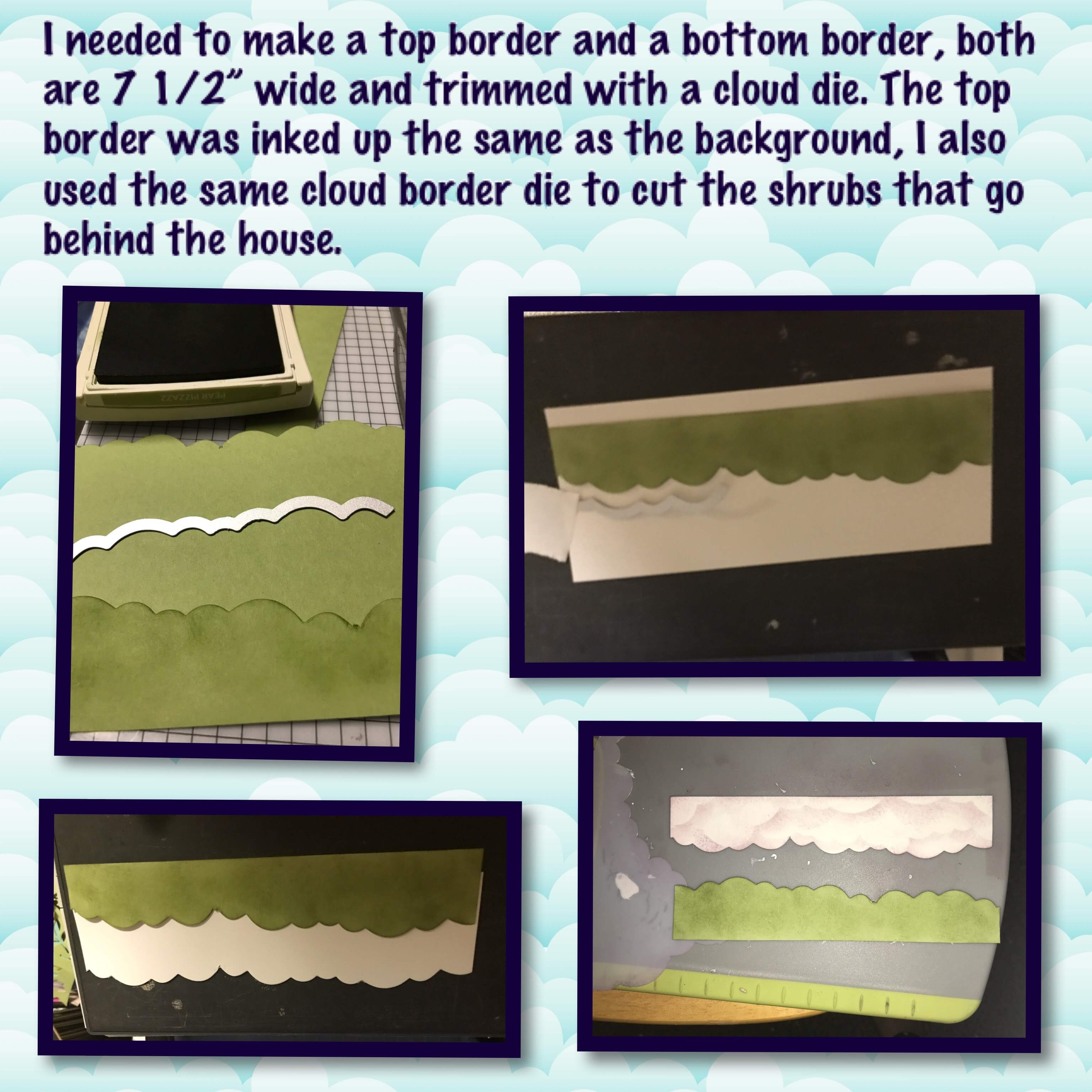 The green cardstock for the bottom border is Pear Pizzazz, I inked up the cardstock with Pear Pizzazz ink to give it some texture. I used a cloud edge die to cut the borders for the top and the bottom.