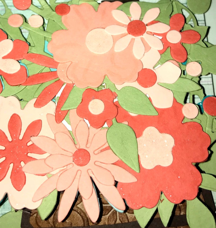 the flowers are from 2 other Karen Burniston die sets, one of them is the Woven Basket the second one is Flower Pot Pop up the leaves are from these sets as well, the ivy leaves are from my thrift store stash.