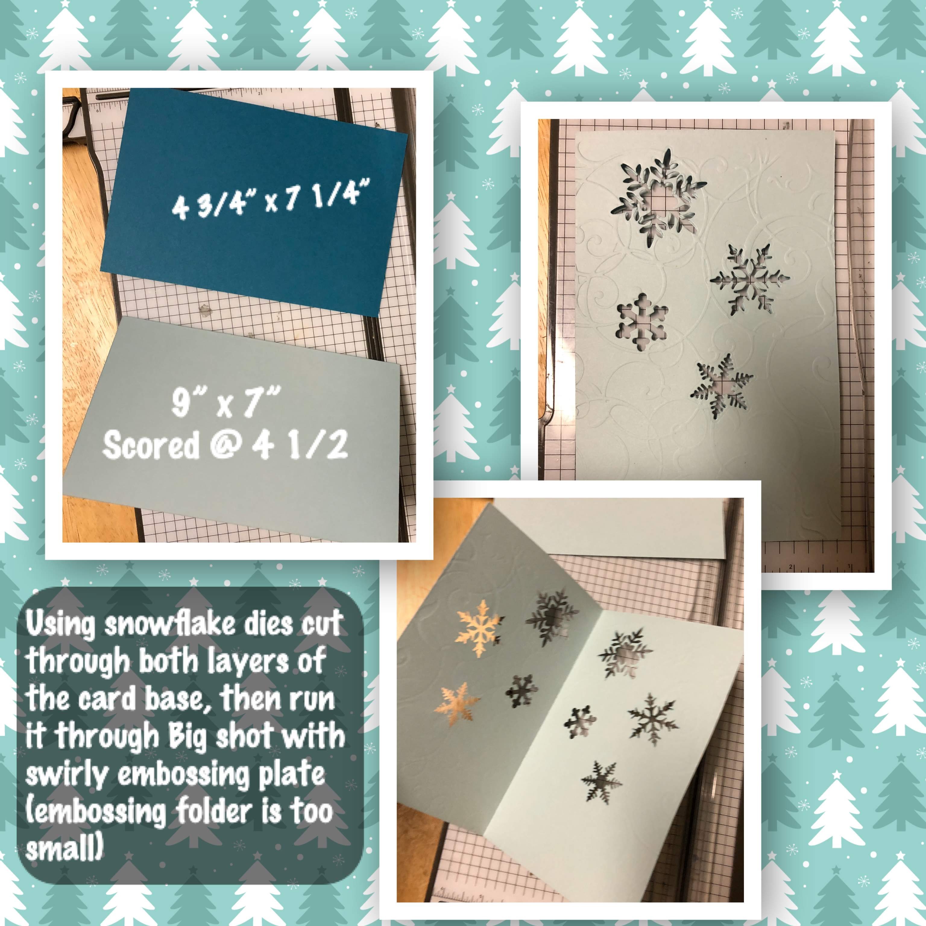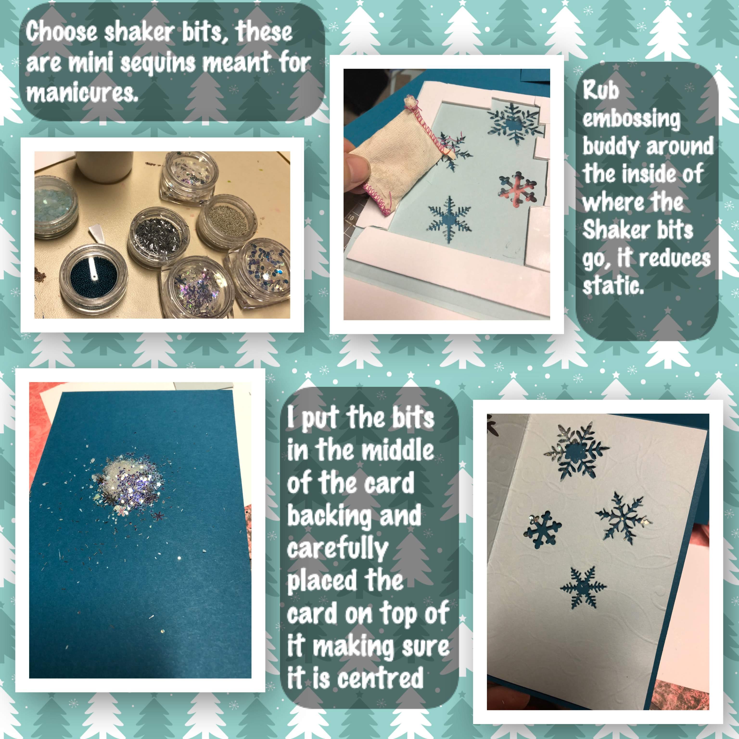 I love shaker cards, this one is a little different. Instead of having a large shaker window, I have smaller snowflake sized windows, and the window shapes are cut through the front and middle pf the card with the shaker bits added to the very back panel.
