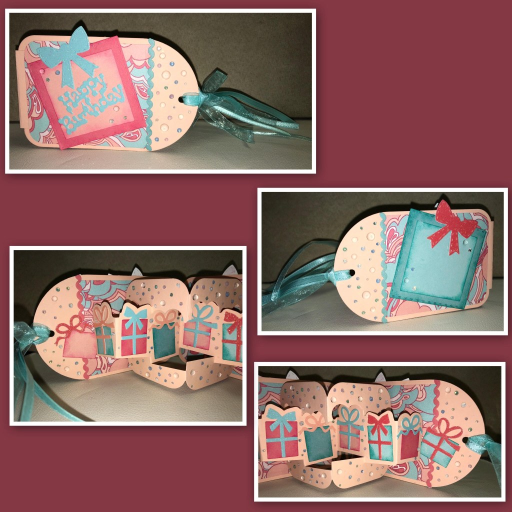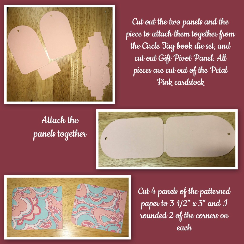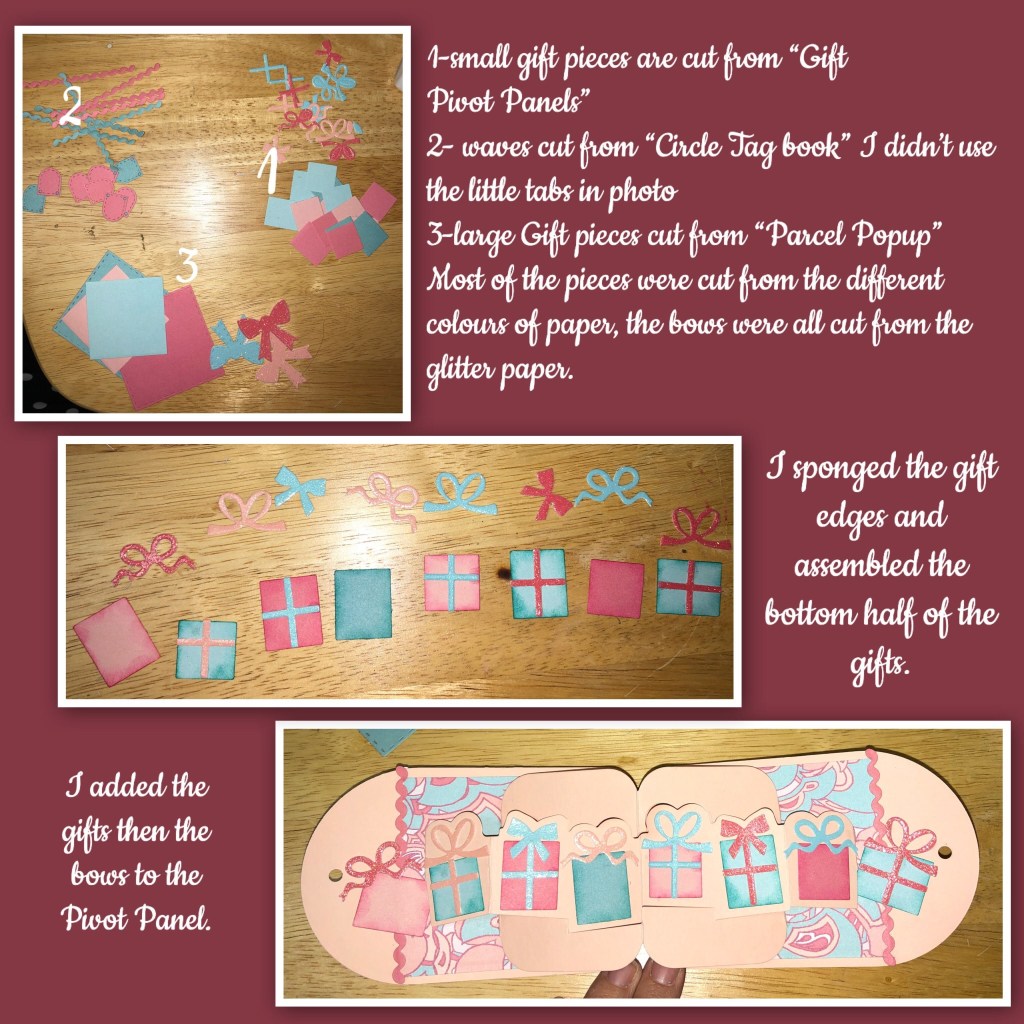 The dies that I used are all from Karen Burniston. The card base is from the Circle Tagbook and the inside mechanism is the Gift Pivot Panel. I also used the the box and bow from the Parcel Pop up dieset to decorate the front and the back panel. Check out this VIDEO on how to create this mechanism (the only difference is I added mine inside the panels for the Circle tag book instead of a standard cardbase)