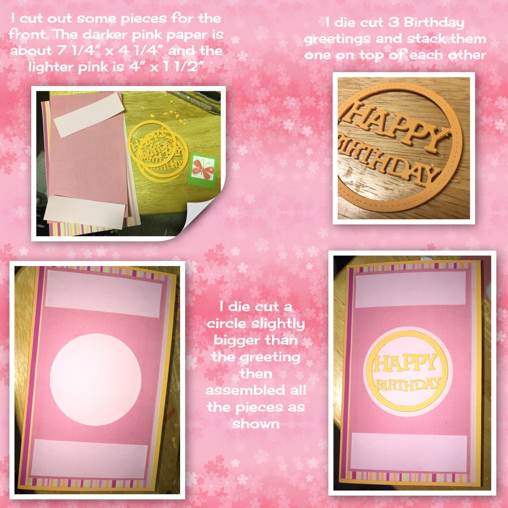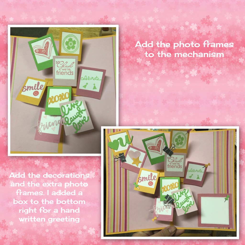 The cardstock is from Stampin Up, and the paper is from my stash. I used the Karen Burniston Photo Collage die set for the card, mechanism and decorative pieces. I REALLY recommend watching this tutorial VIDEO it will make assembly much easier.