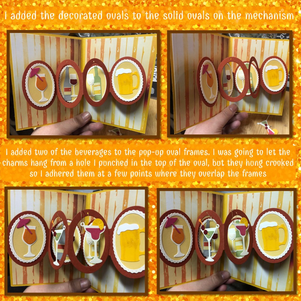 The die set used for the mechanism is the Oval Frames pop up from Karen Burniston. The Happy Hour Charms and the Wine Charms were used to decorate, they are also from Karen Burniston.