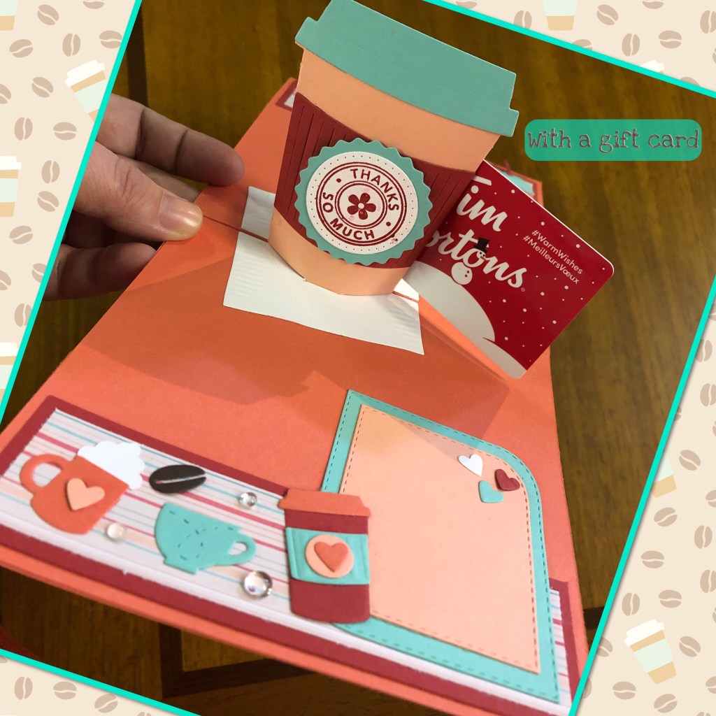 To make the pop up mechanism I used the Coffee Cup Pop Up die set from Karen Burniston.