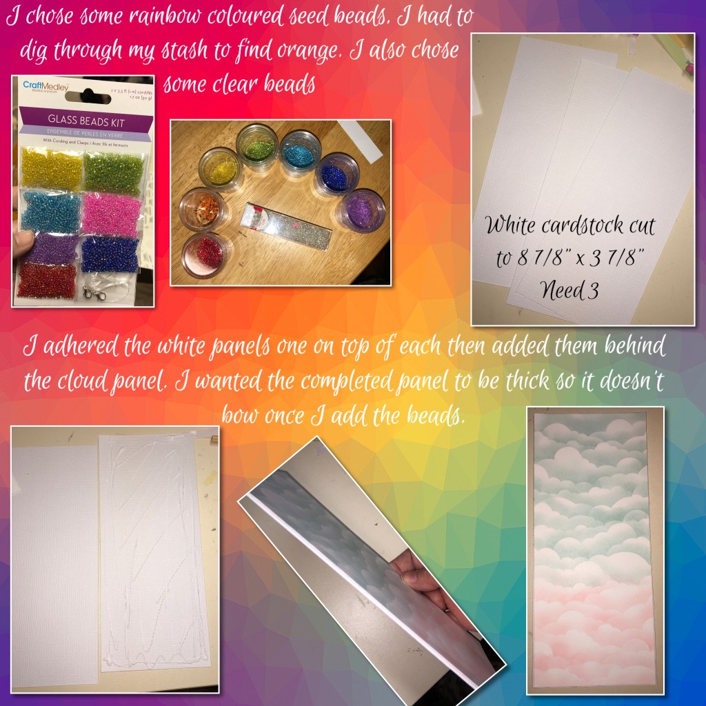 If you’re just making a rain card, you can just use the clear Seed beads. I found my multi coloured seed beads from the dollar store. It did not have orange so I did have to go through my stash to find orange.
