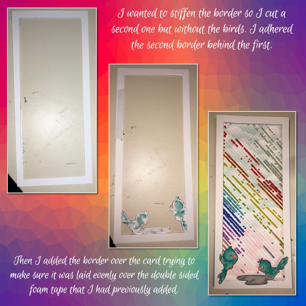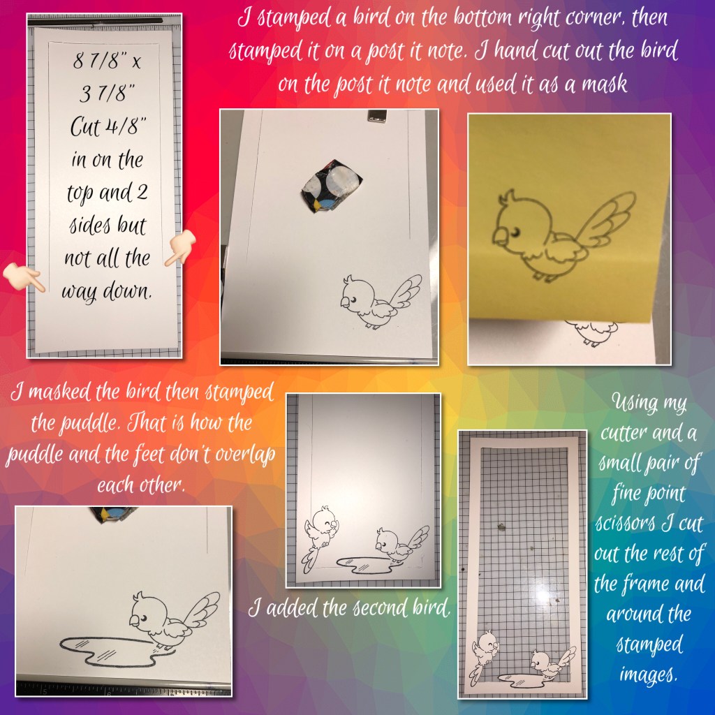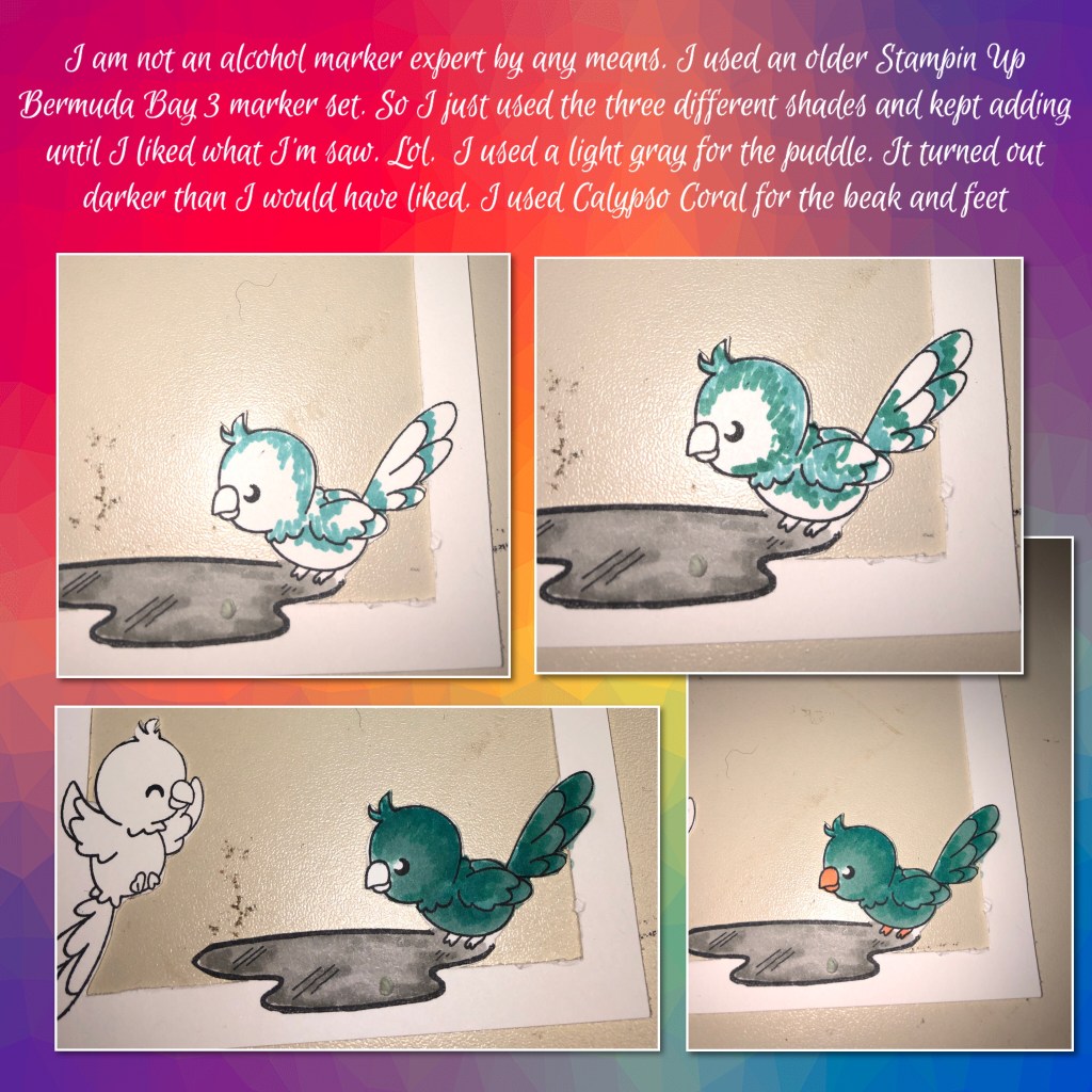 I didn’t actually look up the last Magical Rain card I made. I totally forgot I used the same bird stamps on my first rain card and this rain card. At least I made them different colours LOL. I used Black Memento ink to stamp the images.