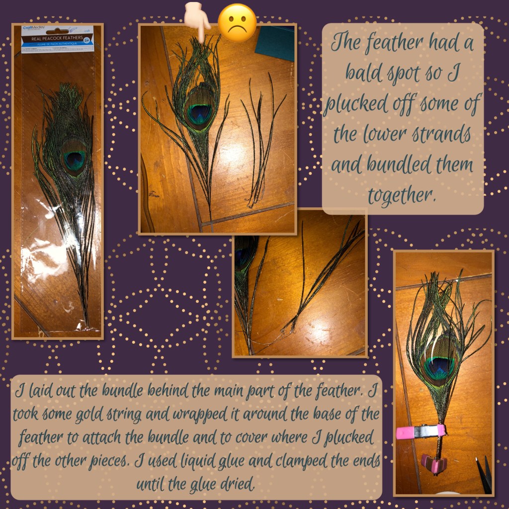 I have never glued a peacock feather before so I randomly added glue to the back and down the gold string. I put a heavy book on top of it until the glue dried.