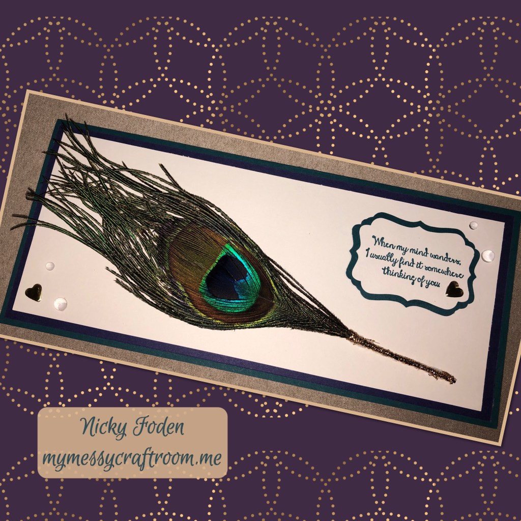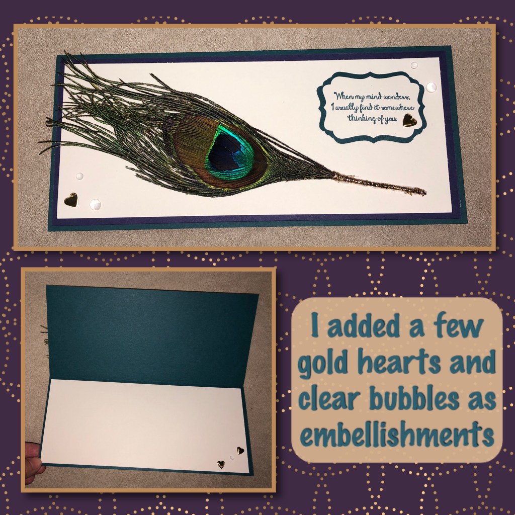 Hello, today I have a very simple card. The hardest part about it would be finding a peacock feather 🤔. I did find mine in a store the info is down below.
