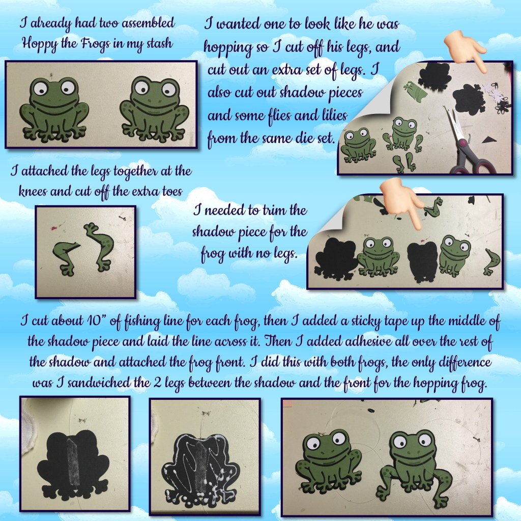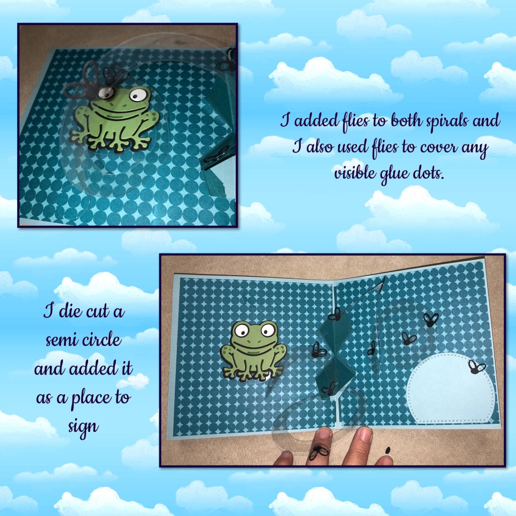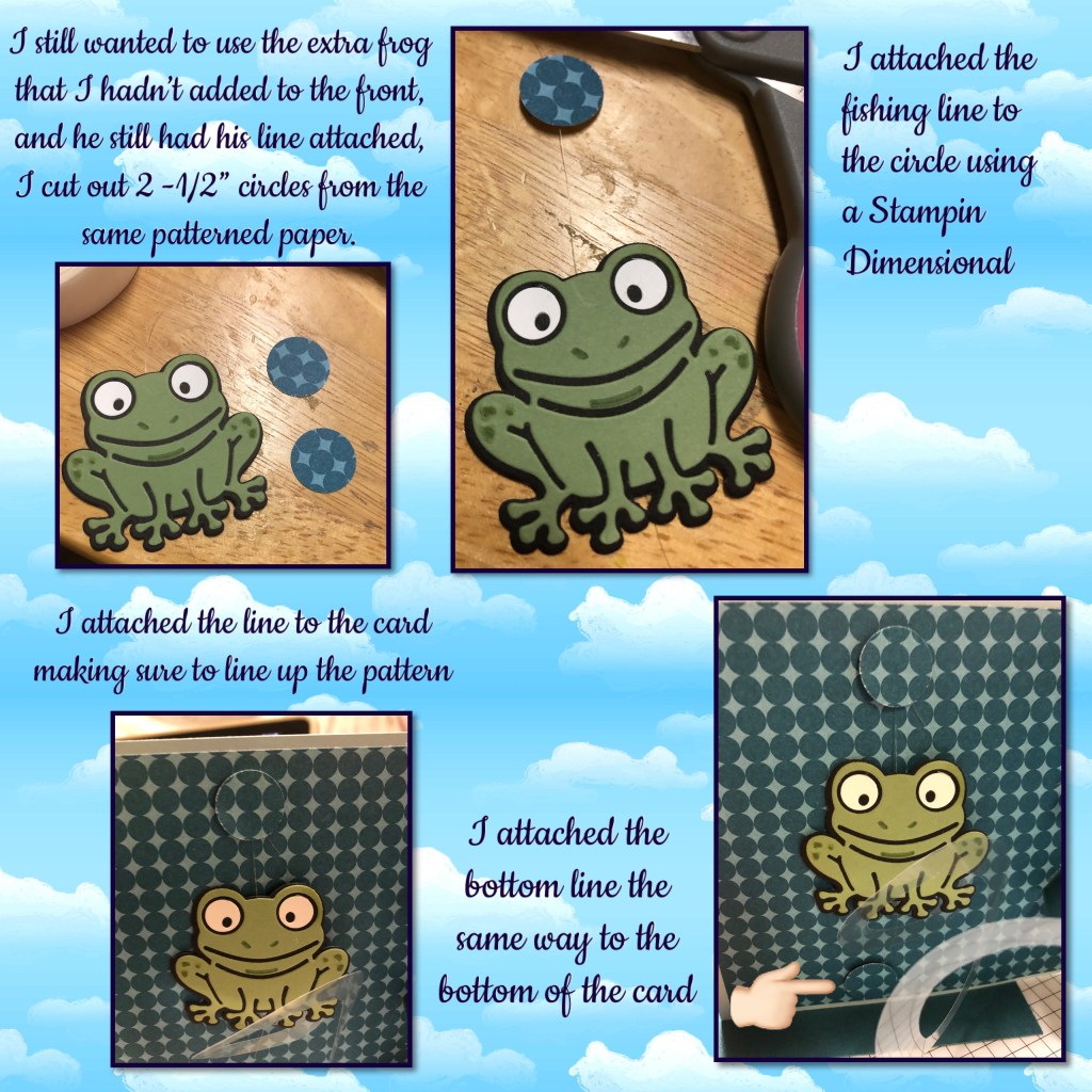 If you watch Karen’s video you would have seen that her paper spirals are strong enough to hold the frog right on it, the acetate spirals are not that strong, I wanted the frog on there and I want him to move a little so I attached him with some Dimensionals and the fishing line to the actual card, so he appears that he is on the spiral without weighing it down.