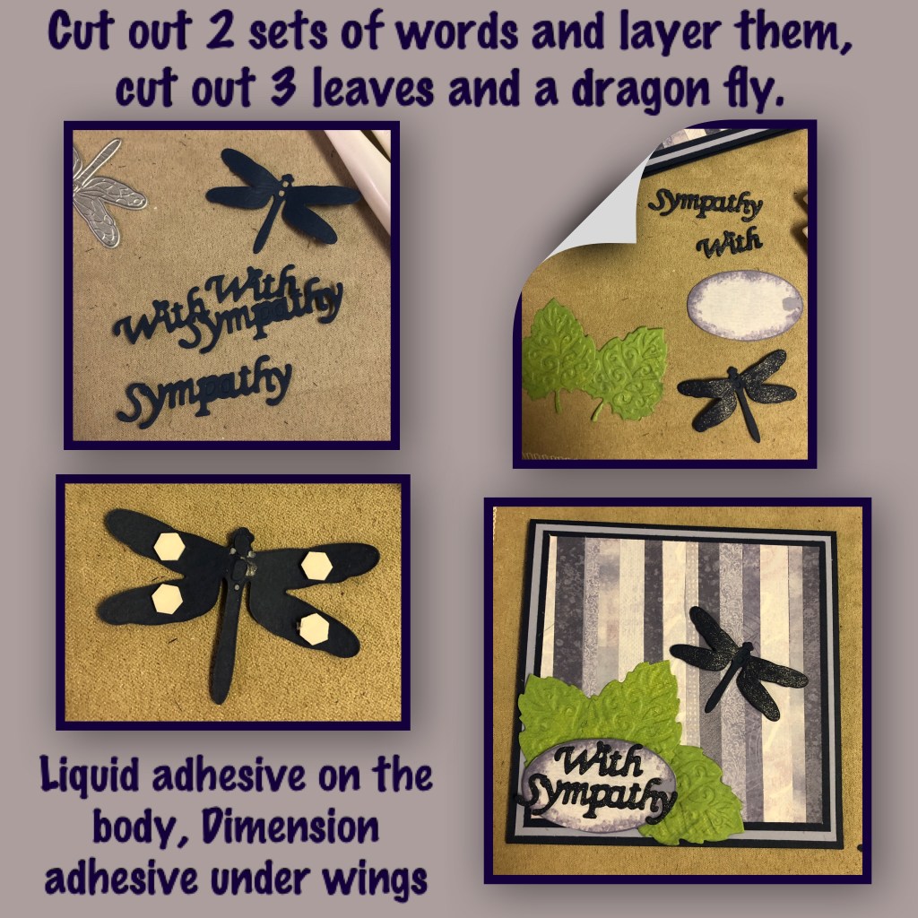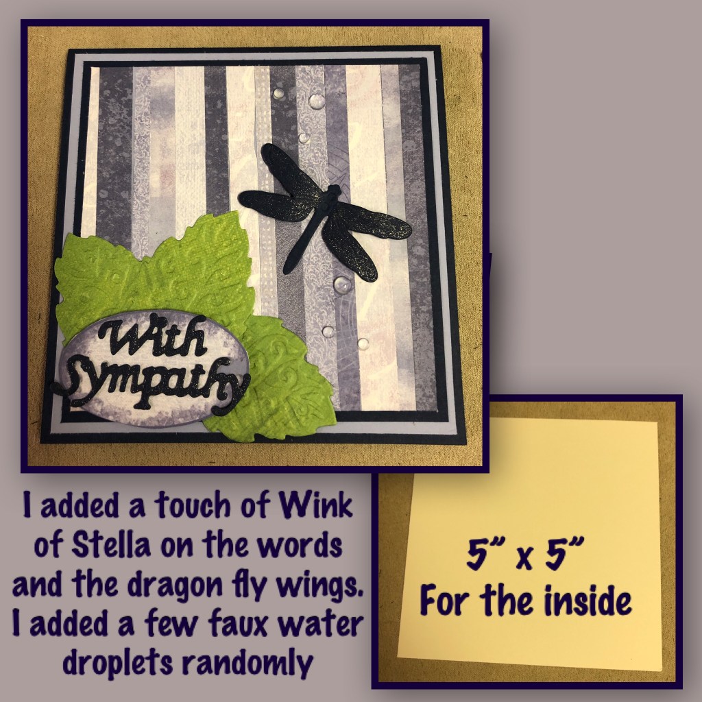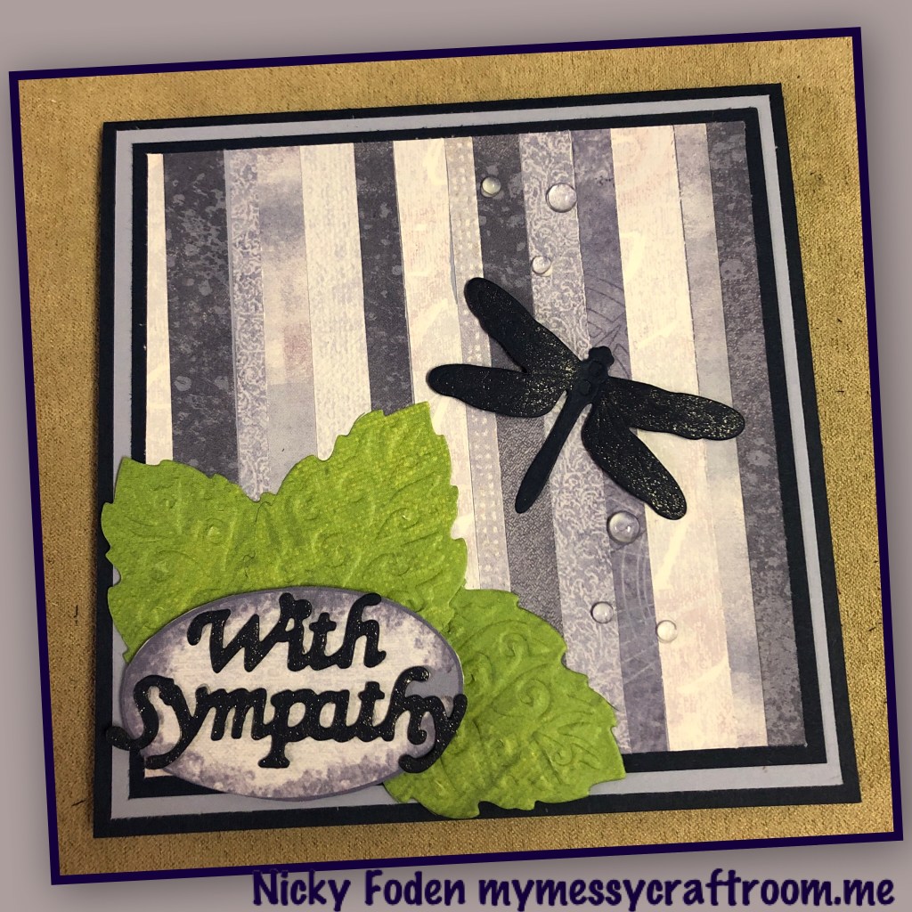 I’ve said it before and I’ll say it again, I find making sympathy cards the hardest. I generally try to make a few ahead of time so I have one when needed, but I happened to be out, and unfortunately I needed one. This weeks challenge is to make a card using stripes so I used this challenge to help me make this card. I feel that sympathy cards should be simple, so this weeks card has no bells and whistles, no pop ups, no shakers, just a little bit of shimmer to the dragonfly wings and the words.
