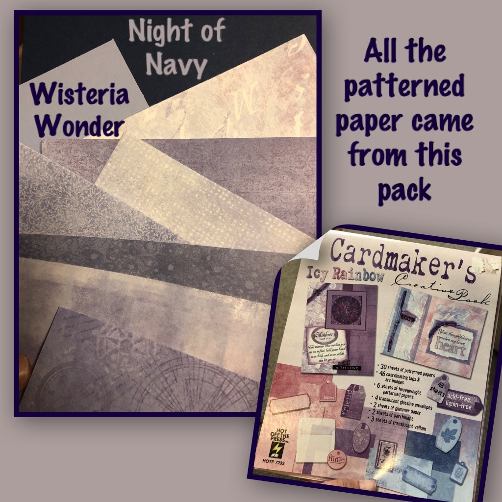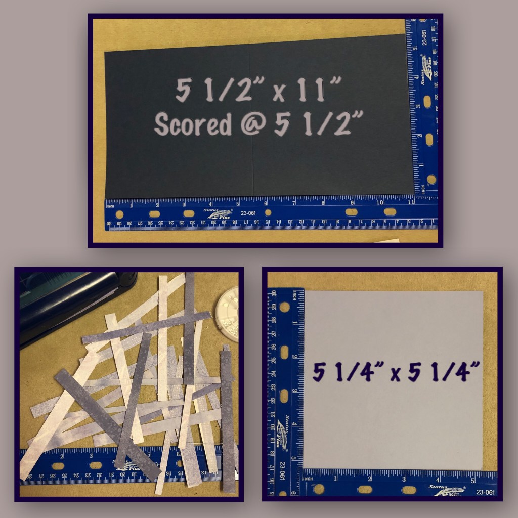 My plan was to adhere the strips in rows onto the Wisteria Wonder cardstock leaving a border around the strips, BUT while working my way from left to right I ended up with an uneven side. So I trimmed the whole piece down to 4 3/4” square then layered that onto a a Night of Navy square, then onto a Wisteria Wonder square then, onto the card base. (Dimensions listed below) I think I like it better with the stripes up against the Navy as apposed to the Wisteria Wonder.