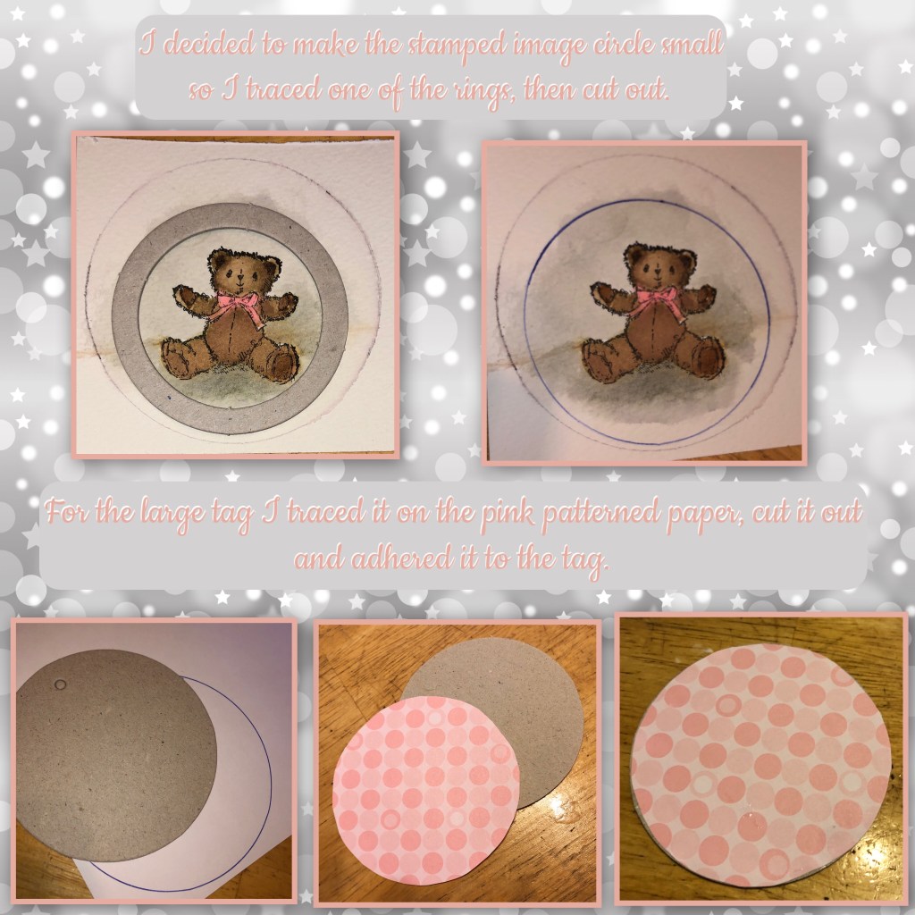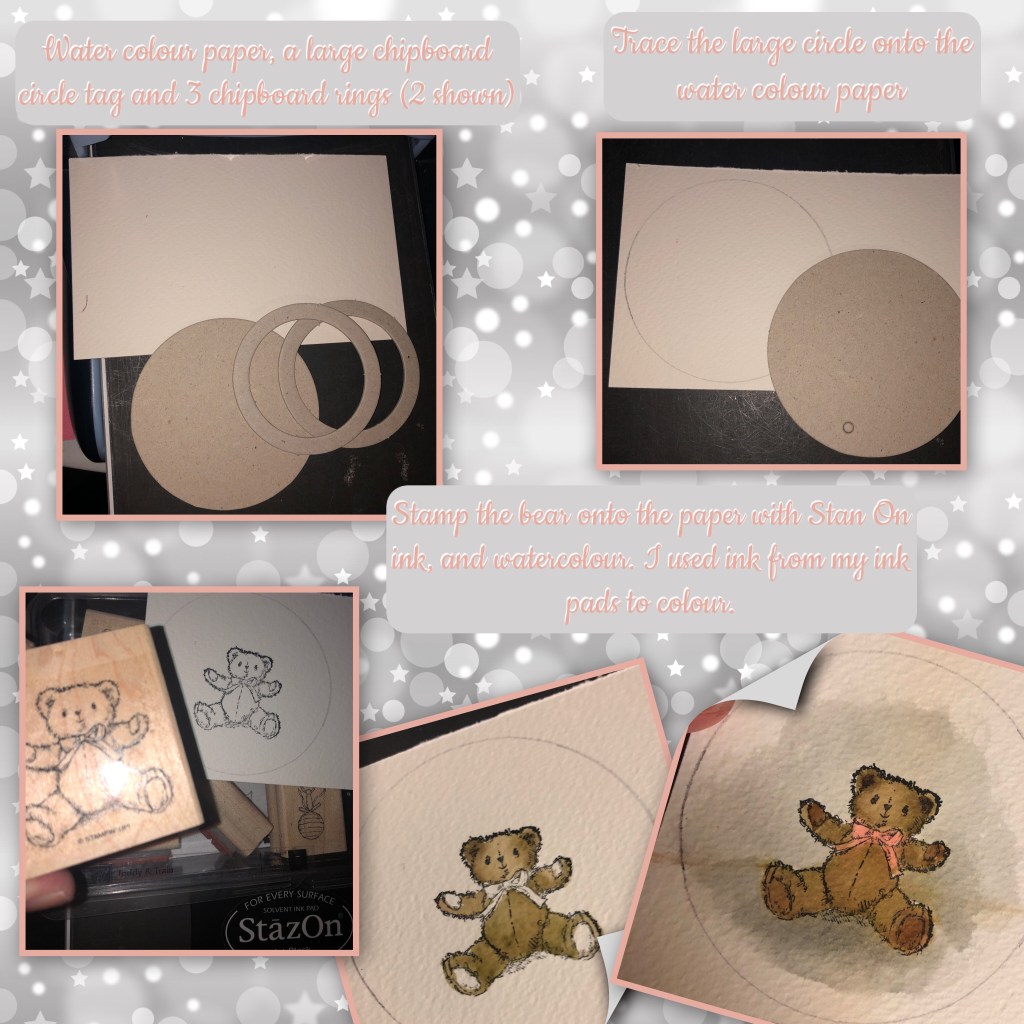 I water-coloured a cute bear for the focal point, sorry it’s a retired Stampin Up stamp set. The chipboard pieces I used a also retired Stampin up. You can get the same look from using foam adhesive I just happen to be out of foam adhesive at the moment.
