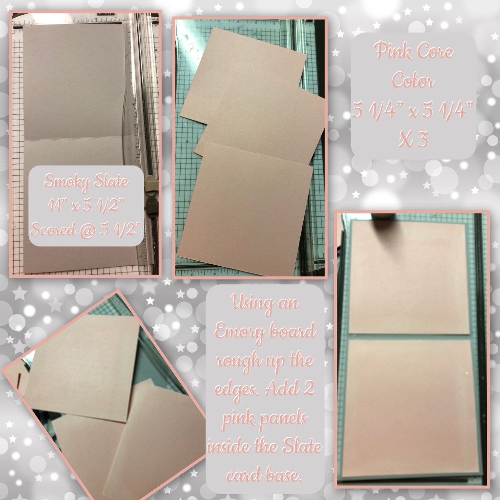 This card uses a variety of old and new items from my stash, like I’ve said before “use what you’re got”. The patterned paper is old Stampin up paper and the pink cardstock is Core Color cardstock. On the front I also used Water Colour Paper , Smoky Slate cardstock and Very Vanilla cardstock from Stampin Up. The rest of the supplies I’ll mention as I go.