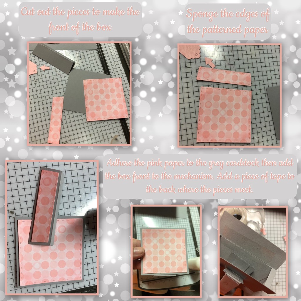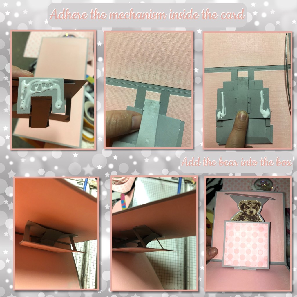 The pop up mechanism is the Parcel Pop up from Karen Burniston. I have photos to use as reference but I recommend watching her tutorial VIDEO as it is a tricky mechanism to make. I watched the video every time I make this style of card.