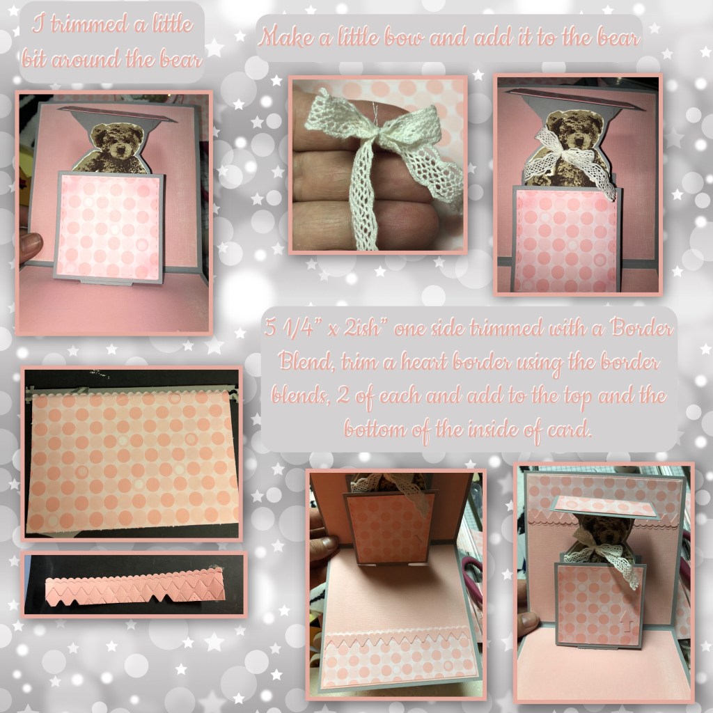 I used the Border Blends Argyle die set to trim both borders and the heart border as well. The ribbon that I used for the bow on the inside and the outside is from my stash and I believe I got it from Dollar Tree.